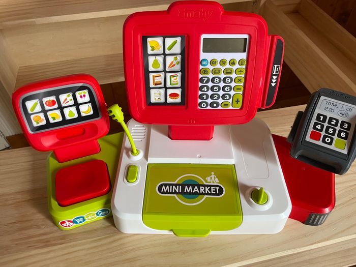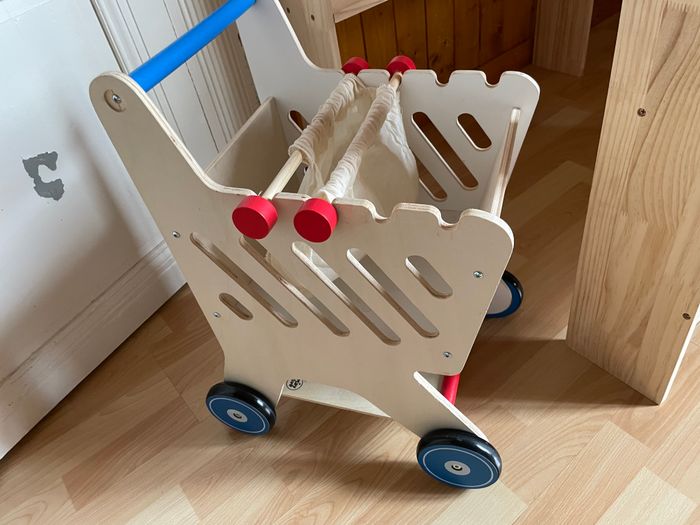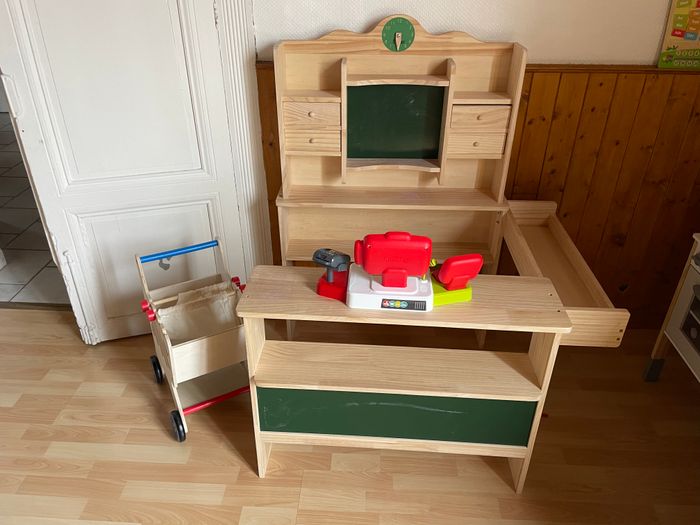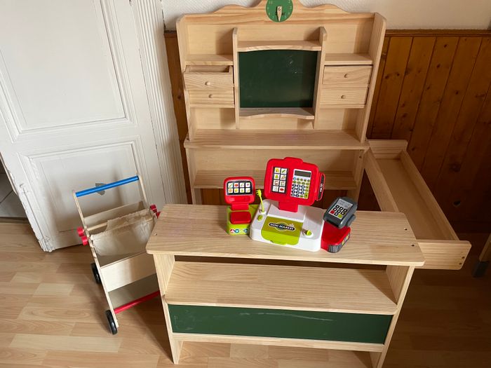 Vend marchande en bois, caddie en bois, caisse enregistreuse, le tout acheter en décembre.