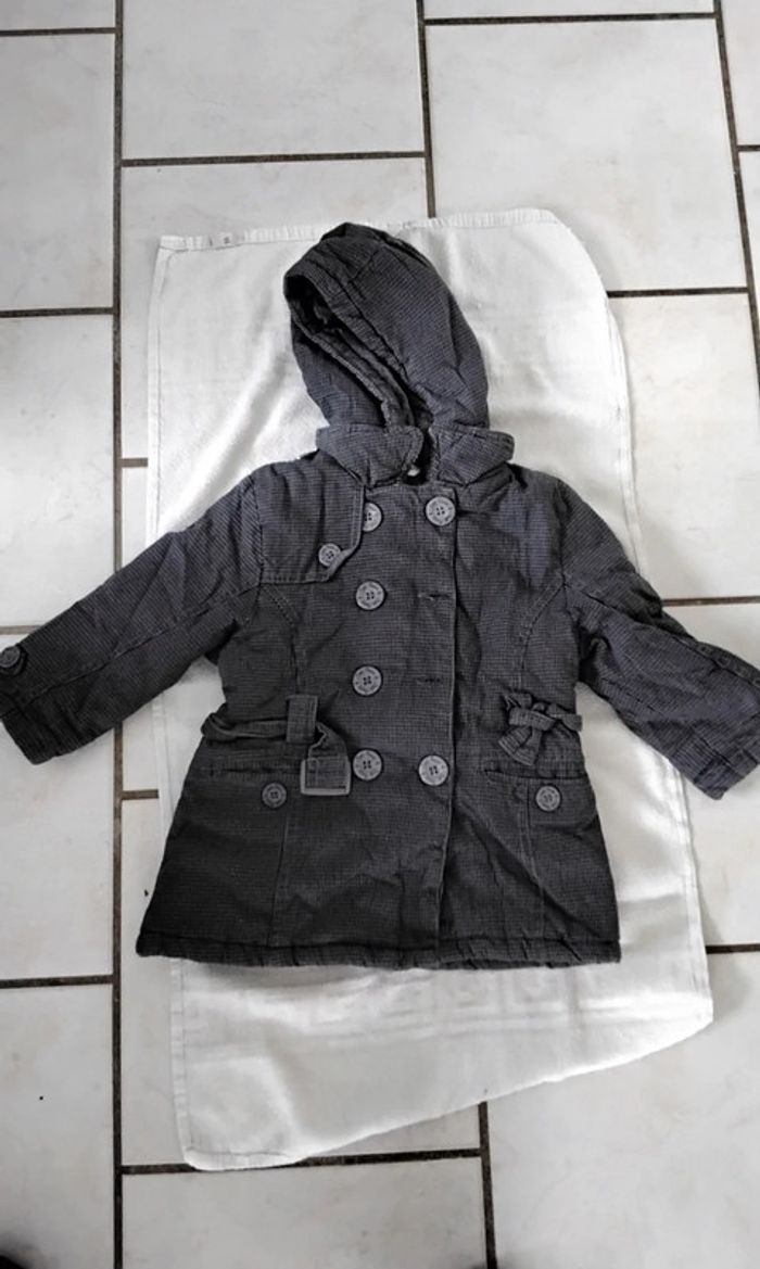 Manteau gris avec des rayures noirs Avec une capuche qui s enléve Ce ferme avec une fermeture, des boutons et une ceinture 2 poches De marque Kidkanai Taille 24 mois 86 cm #moreau36_fille_2_ans