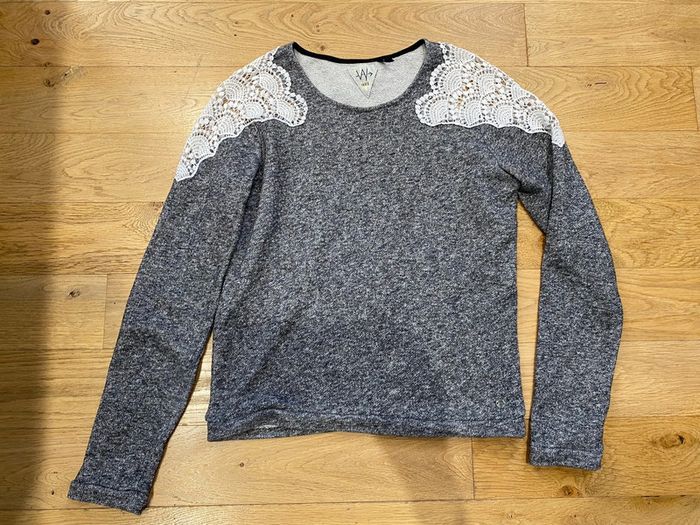 Pull/sweat Marque Ikks Taille M Gris avec des brillants, aux épaules de la dentelle (un accro sur la dentelle —> voir photo)