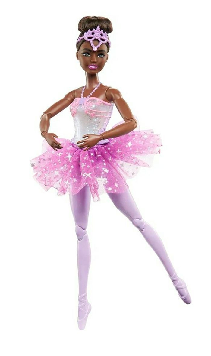 NEUF JAMAIS OUVERT Dés 3 ans Tout est plus magique avec la danse classique Regardez les poupées Barbie ballerines briller et scintiller de mille feux lorsqu’elles dansent Cette poupée Barbie a des cheveux noirs coiffés en un chignon classique et rehaussés d’un diadème élégant Appuyez sur le bouton au niveau de la taille de la ballerine pour voir son body s’illuminer Elle est dotée de cinq modes lumineux de différentes couleurs ​Cette poupée Barbie tournoie avec élégance dans son tutu violet scintillant et ses chaussons de danse travaillés Son corps est articulé pour reproduire tous les pas de danse au fil des histoires