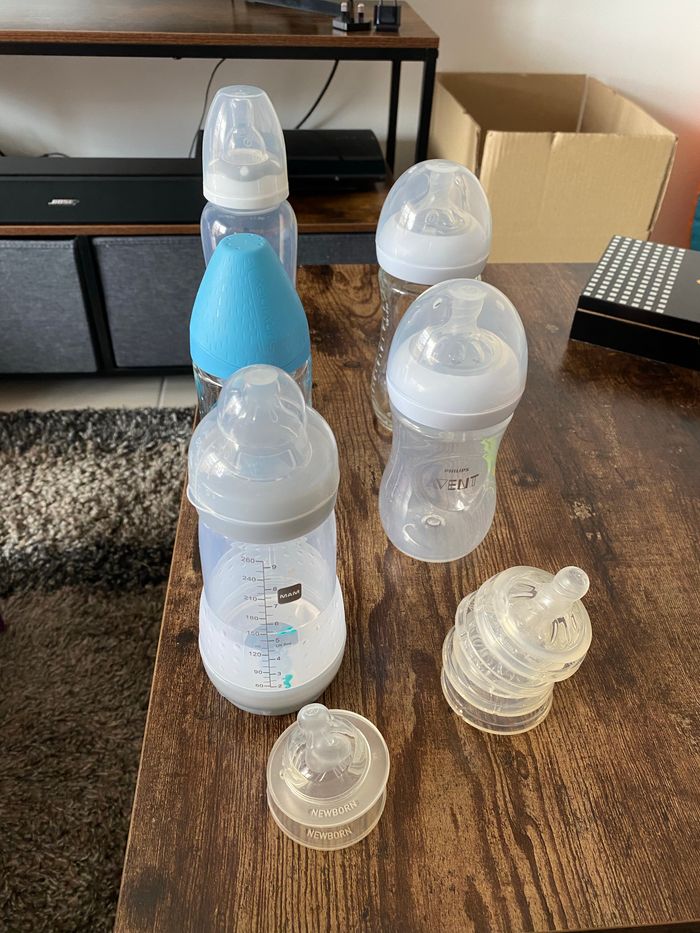 Bonjour, Je vends : -1 biberon suavinex avec tétine ronde - 2 biberons avent natural avec deux tétines débit 0 , deux débit 1 et deux débit 2 - 1 biberon mam avec deux tétines débit 0 et une tétine débit 2. - 1 biberon acheté à Leclerc avec deux tétines en caoutchouc. Ces biberons ont juste été essayé par mon fils une fois donc très peu utilisé. Ils sont en très bon état.