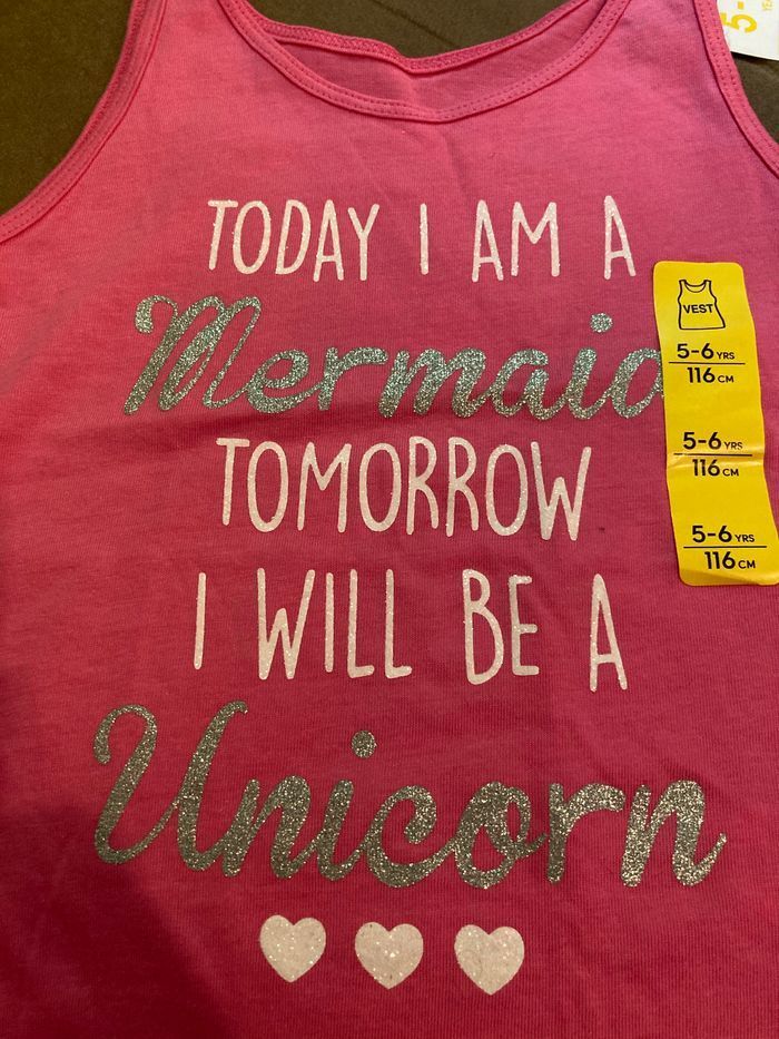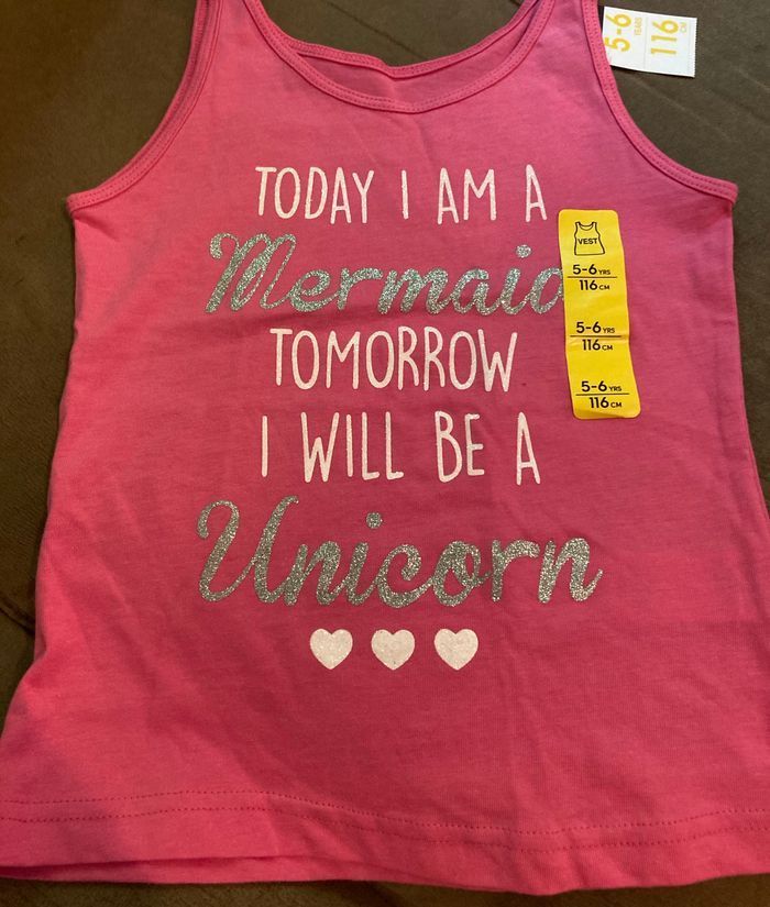 Débardeur rose avec l’inscription en anglais Aujourd’hui je suis une sirène demain je serai une licorne Taille 5/6 ans Neuf et étiqueté car laissé au fond de l’armoire Envoi rapide et soigné