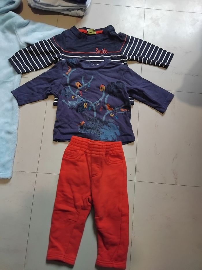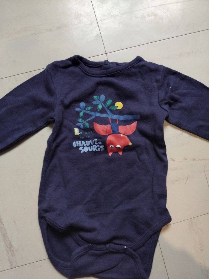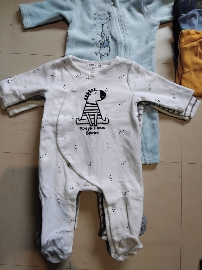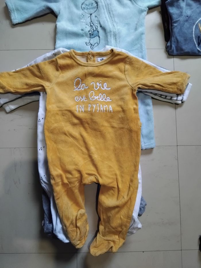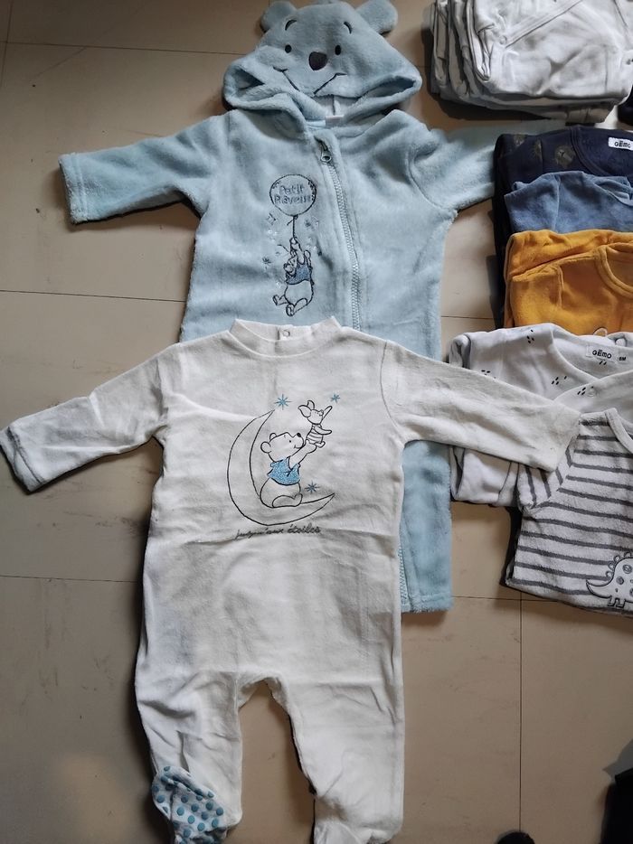 Ce lot comprend : 6 bodies avec ouverture croisée gémo 1 bodie dpam ouverture pression au dos 1 surpyjama tout doux et une grenouillère disney 6 pyjamas gémo dont le bleu est légèrement bouloché. 1 ensemble de 2 t-shirts ML et un jogging catimini 1 ensemble de 2 t-shirts ML et 2 joggings doublés sans marque. Le tout en parfait état à part le pyjama avec les bouloches.