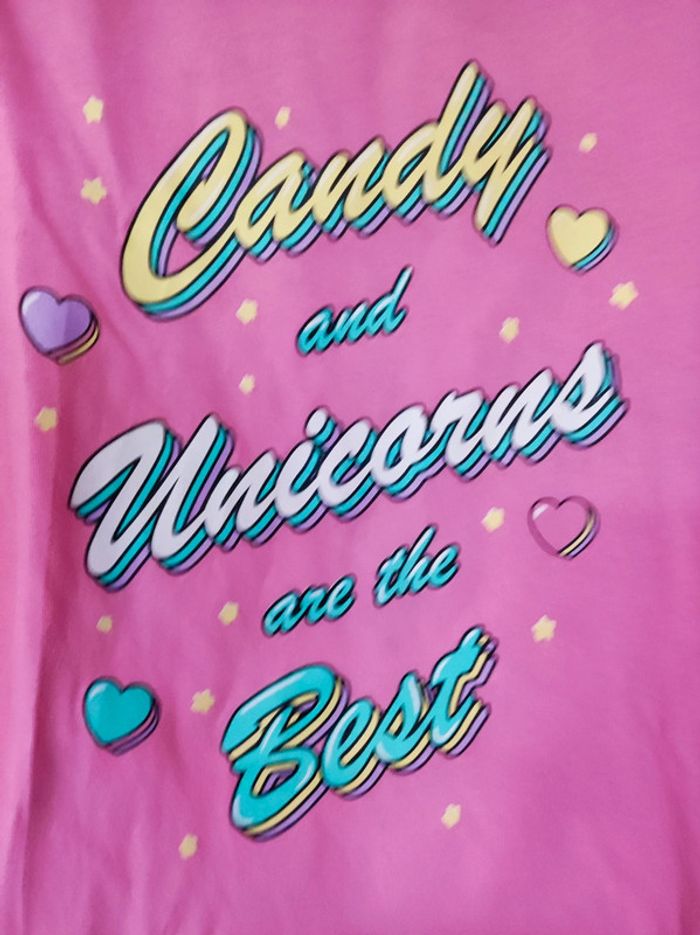 Sweatshirt / tee shirt manches longues Sous pull Marque Primark Taille 8 a 9 ans - 134 cm Col rond / coloris rose avec écriture multicolore relief Candy and Unicorns are the best Style fantastique annees 80 - 90 Parfait état En coton ( sans étiquette) #jemholofille8ans #jemholofille9ans
