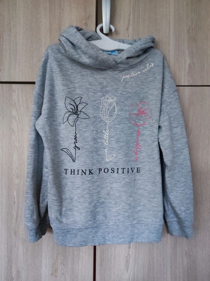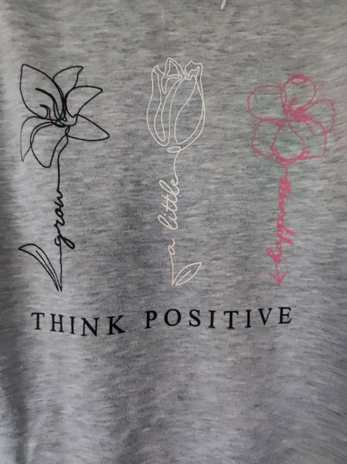 Pull / sweat a capuche Taille 8 à 9 ans Primark Manches langues. Voloris gris chiné et dessins avant de fleurs en mode design : noir blanc pailleté et rose. Écriture noir thing positive. bord côtelé Parfait état 60 % coton / 40 % polyester #jemholofille8ans