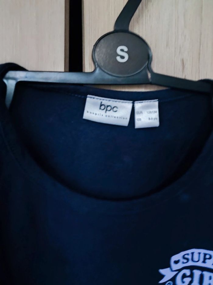 T shirt Marque Bonprix collection / bpc Taille 8 a 9 ans Col rond. Coloris bleu foncé ( marine ) avec écriture rétro type pin pup super girl limited edition et petit cœur violet ( lilas ) 100 % coton ( garantie global organic textile ) Parfait état #jemholofille8ans #jemholofille9ans