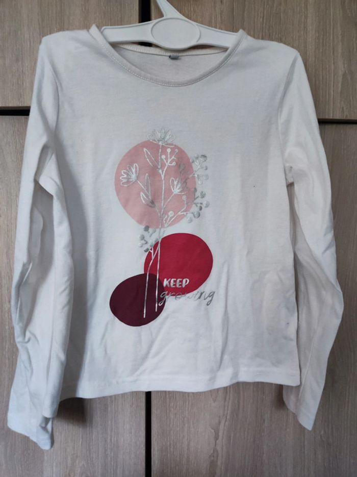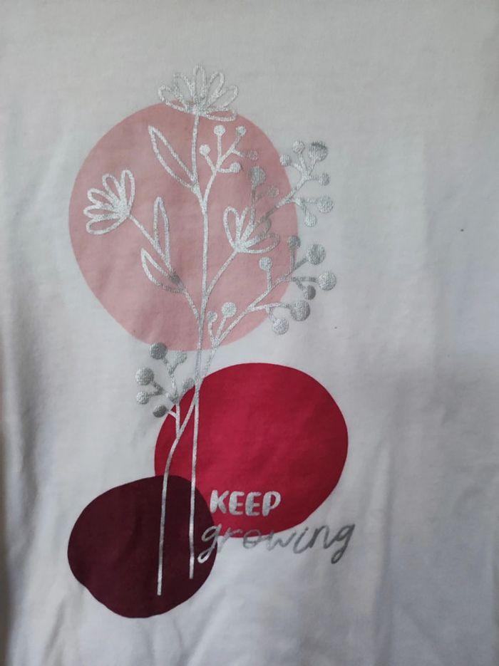 Tee shirt manches longues / pull fin Taille 8 ans Idéal mi-saison Col rond / coloris blanc avec imprimé fleuri fleurs argenté sur cercle rose & violet ( effet japonisant ) écriture argentée ' keep growling ' En coton et elasthanne ( sans étiquette matière) Parfait état #jemholofille8ans