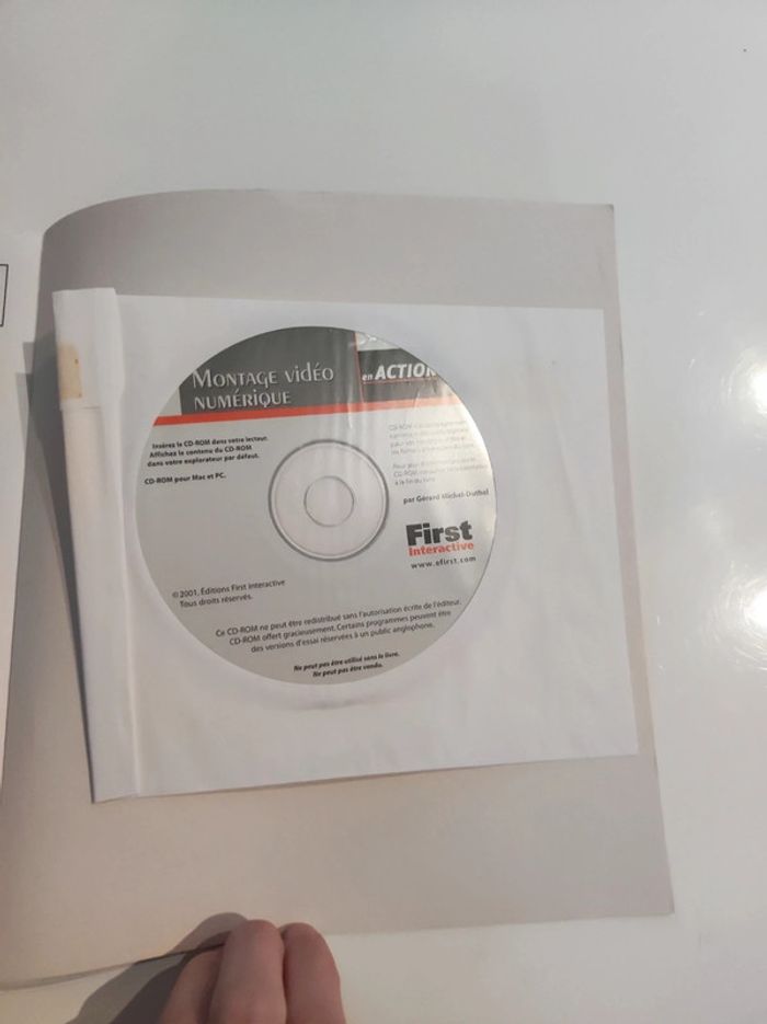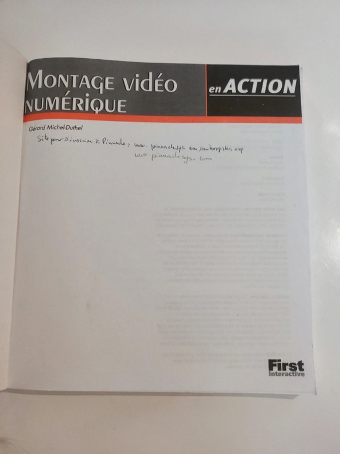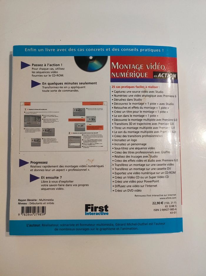 Livre Montage video numérique en ACTION / 25 cas pratiques et conseils d'expert De Gérard Michel-Duthel, auteur , realisateur et formateur multimedia First interactive, 2001 - 211 pages Initiation à la vidéo numérique destinée aux débutants, sous Windows ou sous Mac OS. Permet d'en comprendre les notions de base, de découvrir les possibilités d'acquisition de séquences à l'aide de divers matériels, de connaître les possibilités de montage et de création d'effets spéciaux à l'aide des logiciels Adobe Premiere et Pinnacle Studio DV, d'apprendre comment transférer les vidéos sur cassette ou disque compact et d'en faire la diffusion sur Internet ou dans un PowerPoint. Explications brèves et claires, nombreuses captures d'écran et instructions pas à pas. Le CD-ROM fournit les outils utilisés en version de démonstration et les séquences vidéo et images utilisées dans les exemples . Très bon etat. Grand format / 21 x 23 cm Une petite inscription sur la première page