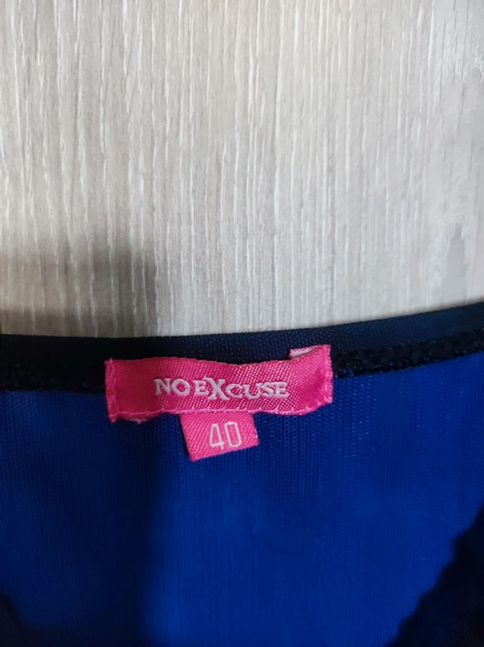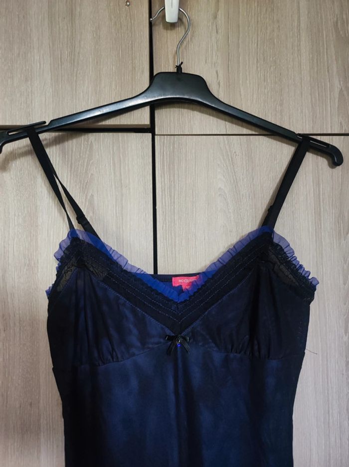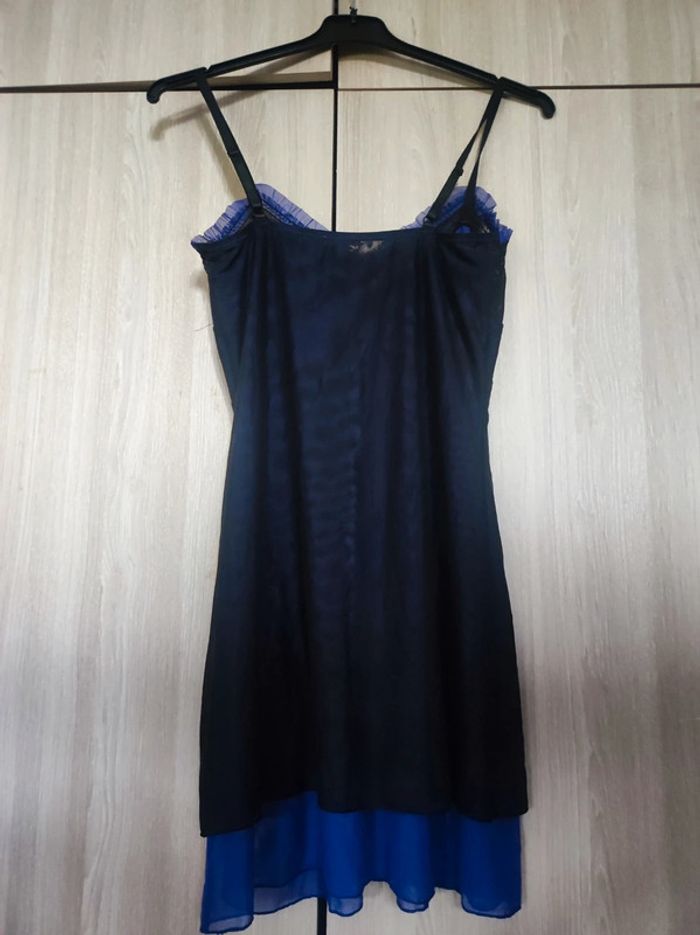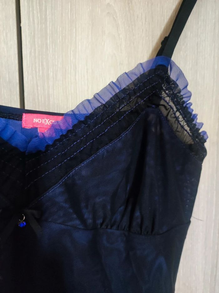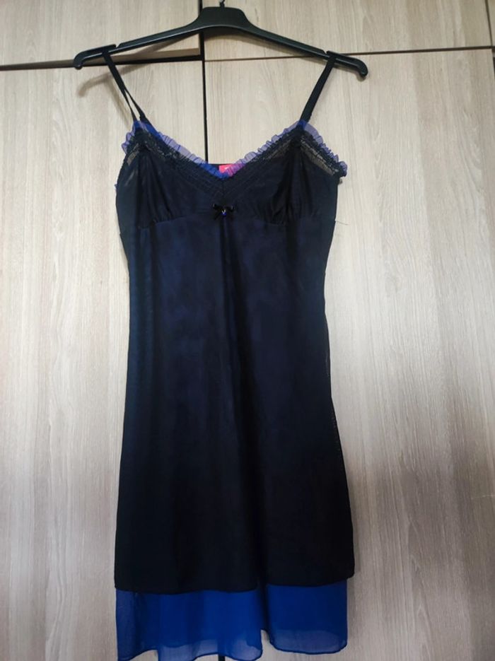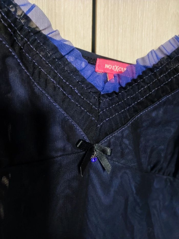 Nuisette / robe de nuit Taille 40 Marque no excuse Toute en transparence , superposition d'un voile noire sur un voile bleu violet qui donne un effet irisé. Flot noir avec finition petit bijou violet effet perle a l'avant. Col v avec effet froncé Manches fines reglables Longueur 80 cm Parfait etat comme neuve Ideal a porter : saint valentin / nuit de noce Pour retrouver tout mes articles sans effort de cette même taille : #jemholofemme40