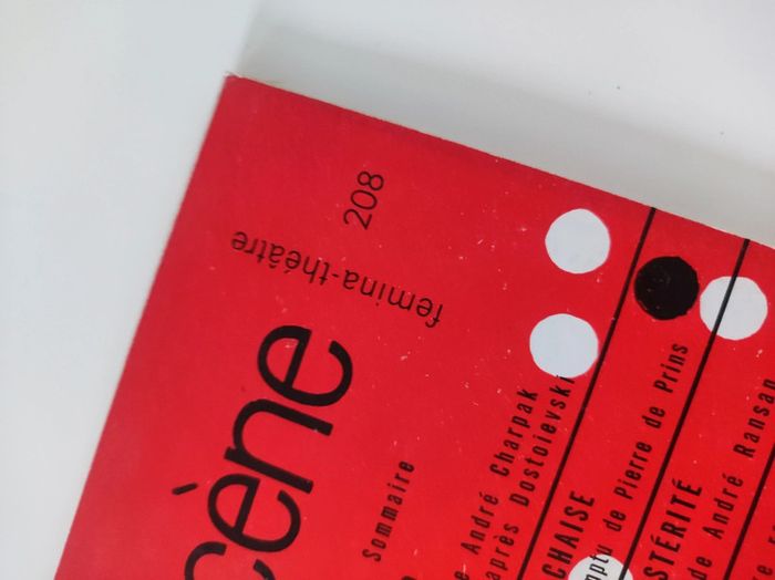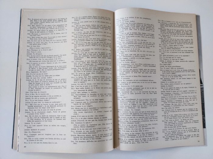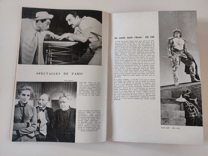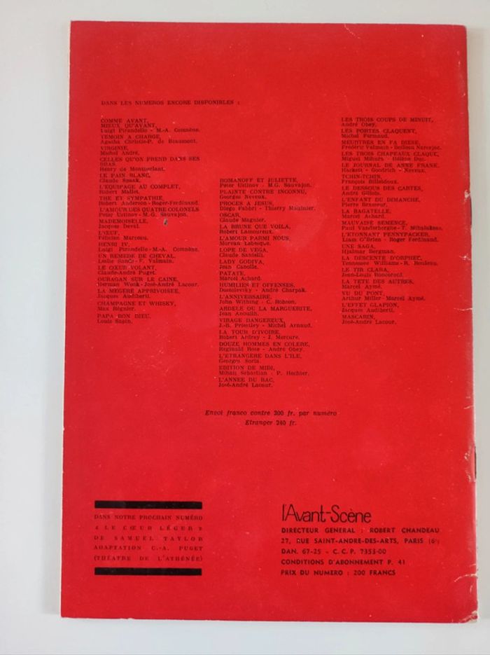 Livre - Revue du theatre ancienne / vintage / annees 50 L'avant scène n°208 de 1959 - femina théâtre Format 26,5 x 18 cm 50 pages couverture rigide Sortie par le bureau de la revue. Sommaire - Le Joueur de Charpak d'après Dostoievski - La chaise , impromptu de Pierre de Prins - La postérité de André Ransan jean Serge raconte le cas dodenatt de Bernard shaw Un livre-revu comportant des pièces de théâtre intégrales avec les détails des mises en scènes, des textes sur les acteurs , les coulisses, les metteurs en scènes, des articles, Des photos en noir et blanc d'acteurs (Jacques Charpak , ...), des critiques, et une mise en avant des sorties théâtre de l'époque. Au centre on retrouve un feuillet photo de la pièce les nègres de Jean Genet avec la cie africaine les Griots. Très bon état ! Interieur impeccable. Imperfections : pages jaunies par le temps. quelques marques sur la couverture Couverture rouge. Attention le livre esr ancien donc l'isbn indiqué sur l'application n'est pas le bon