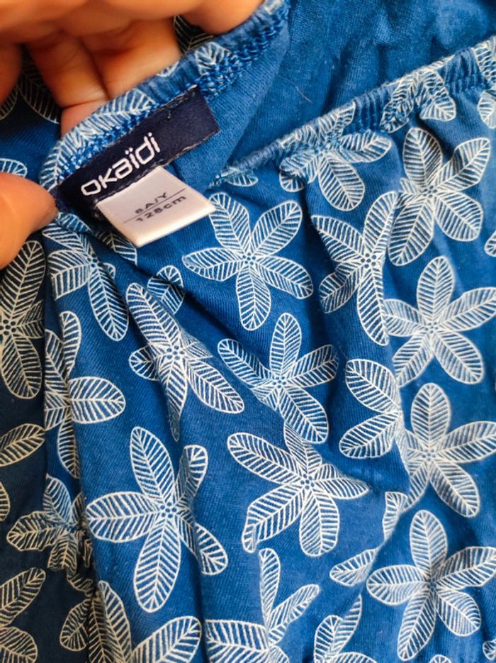 Ensemble estival / combi short Taille 8 ans / 128 cm Marque Okaïdi Sans manches avec fines bretelles croisés dans le dos. Coloris bleu avec motifs fleurs graphiques blanc. Elastique niveau poitrine et taille ( reglable oar cordon tissus bleu ) Parfait etat. Comme neuf #jemholofille8ans