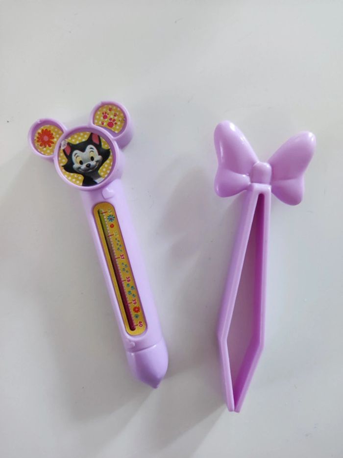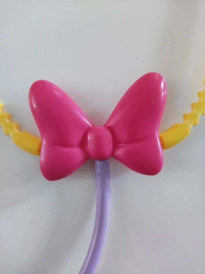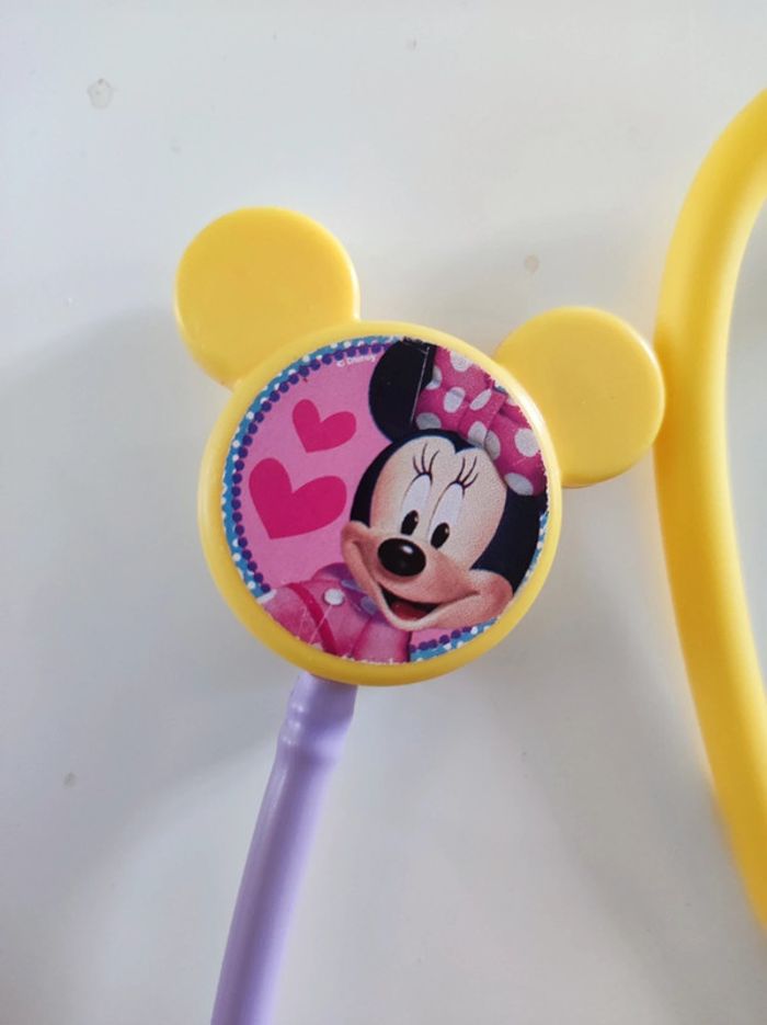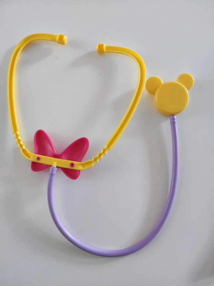 Jouet médical d'imitation Marque Disney Modèle Minnie Composé de 3 articles : stéthoscope Minnie avec petit flot rose Pince et Thermomètre Jeu d'imitation et de simulation pour jouer au docteur En plastique. Couleurs violette rose et jaune Parfait état