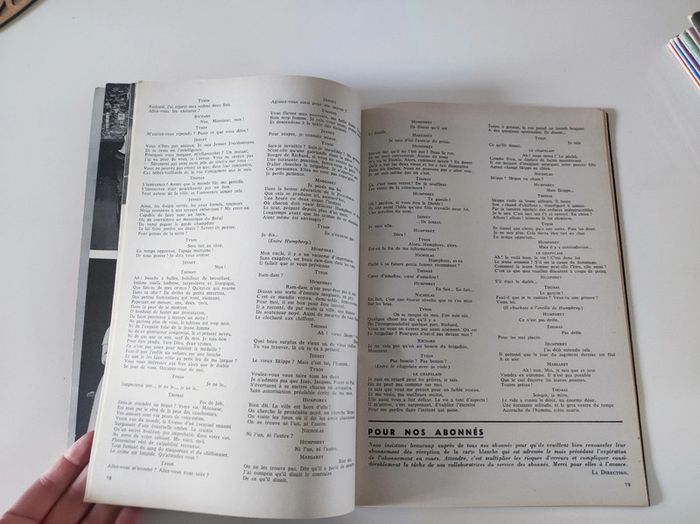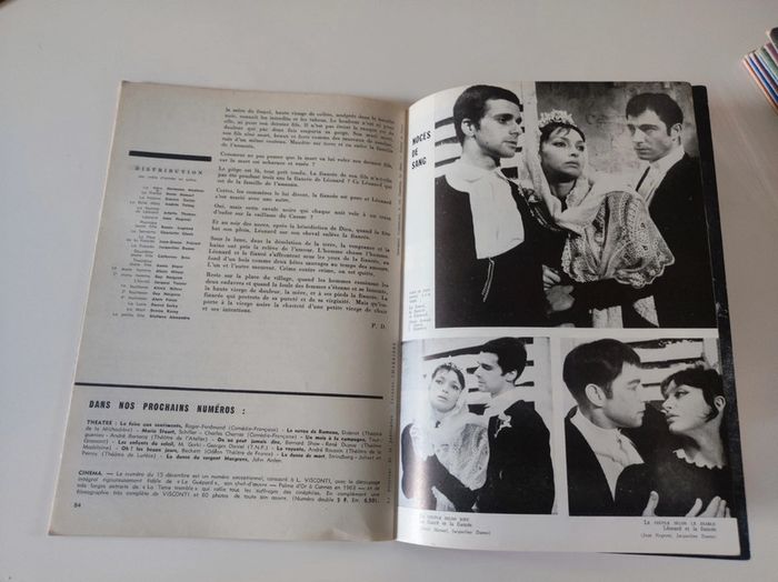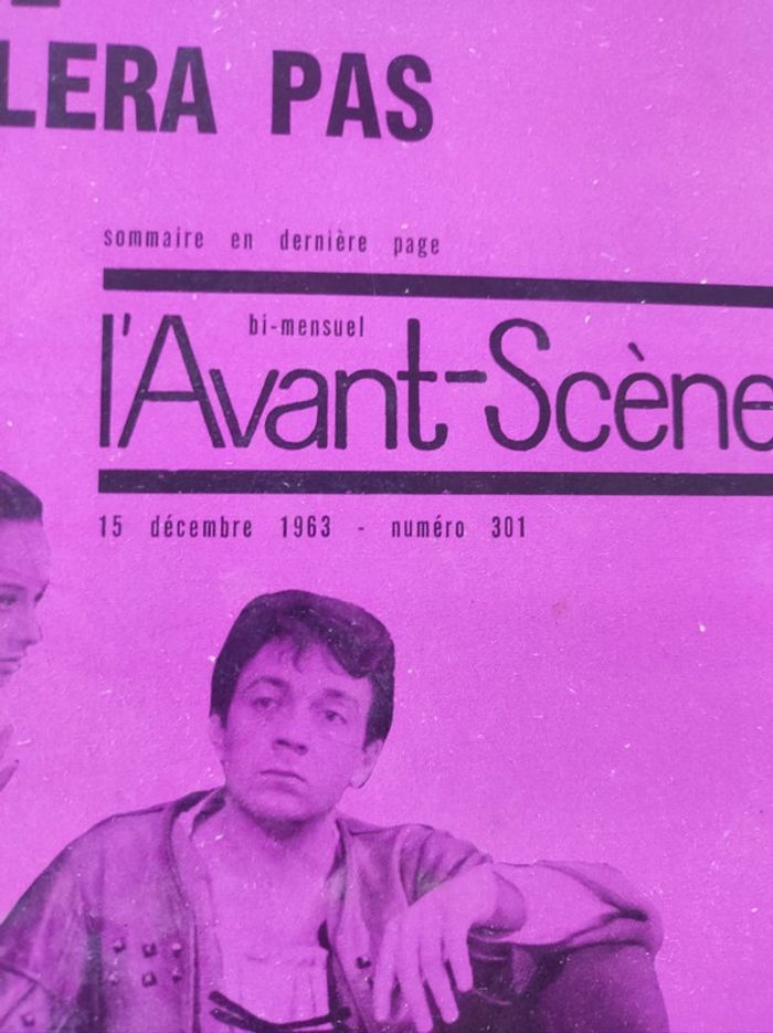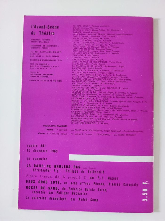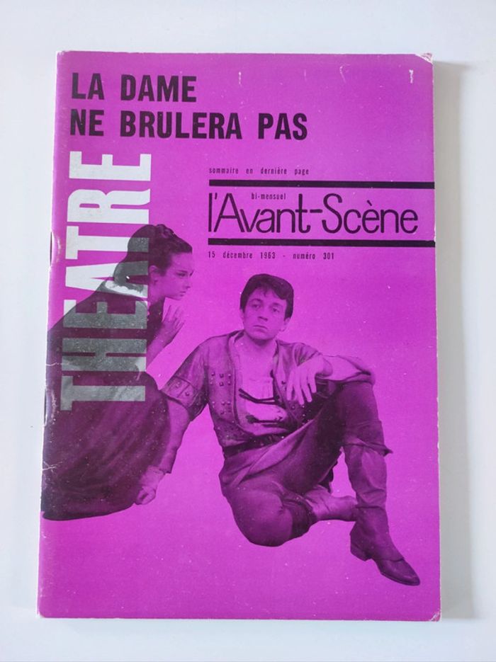 Revue / journal du théâtre ancienne / vintage L'avant scène n°301 de décembre 1963 bi-mensuel La dame ne brulera pas / philippe de Rothschild Format 26,5 x 18 cm. / 58 pages Sortie par le bureau de la revue. Couverture souple Une revue comportant des pièces de théâtre intégrales avec les détails des mises en scènes, des textes sur les acteurs , les coulisses, les metteurs en scènes, des articles, Des photos en noir et blanc d'acteurs par Thérèse Le Prat ( Jean-Pierre Cassel , Francine Bergé, Serge Rousseau , Dominique Vilar..), des critiques, et une mise en avant des sorties théâtre de l'époque. Sommaire : - texte intégrale pièce La dame ne brulera pas par Christophe Fry et Philippe de Rotschild. - article Pierre Franck de A jusqu'à Z , par P.-L Mignon - pièce Deux gros lots , un acte d'Yves Péneau , d'après Caragiale - Pièce Noces de sang de Frederico Garcia Loca , raconté par Philippe Dechartre - la quinzaine dramatique par André camp. Très bon état ! Intérieur impeccable. Imperfections : pages jaunies par le temps. quelques marques sur la couverture. Defaut d'impression la page 44 45 na pas été imprimé. Couverture rose violet Attention l'isbn indiqué ne convient pas. Je nai pas trouvé le bon.