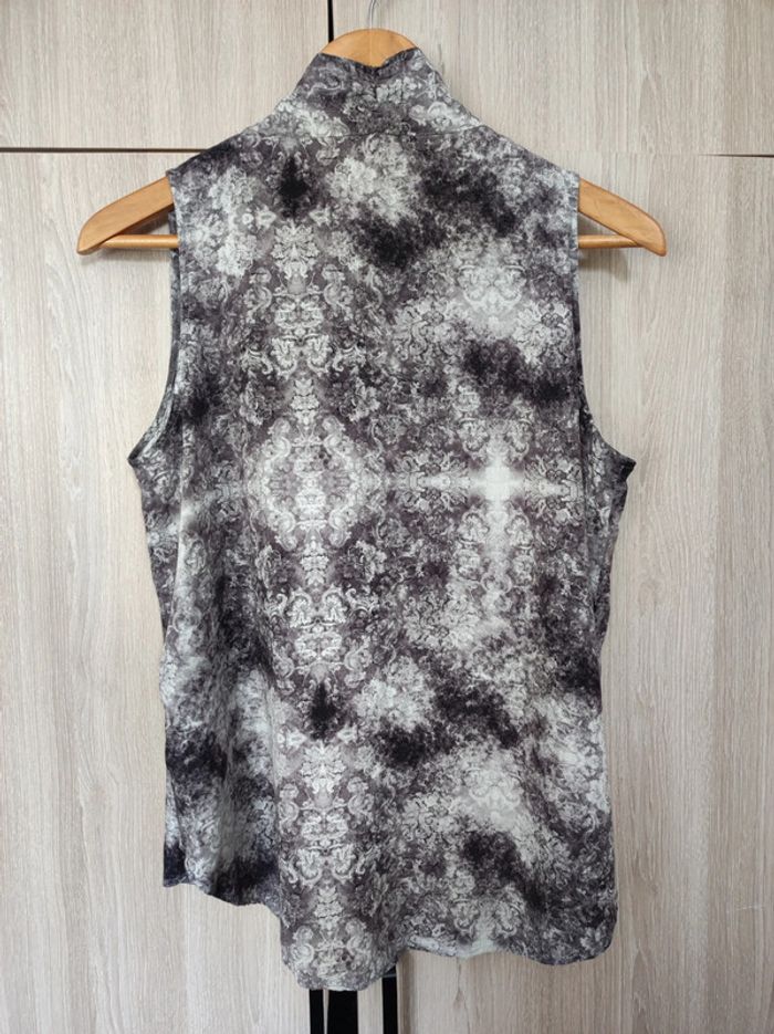 Blouse / tunique / top Taille 42 Marque Miss Liberto essentiel Col avec décollé plongeant Imprimé fleurs arabesque effet brume Style romantique / classique Coloris gris clair / gris foncé & blanc Matière toute douce comme soie Sans manches avec fermeture eclair décorative argentée Coupe originale plissé devant et fente de chaque côté Parfait état sans étiquette matière Dimensions : 50 cm a plat aisselle a aisselle / 66 cm de long. Pour retrouver tout mes articles sans effort de cette même taille : #jemholofemme42