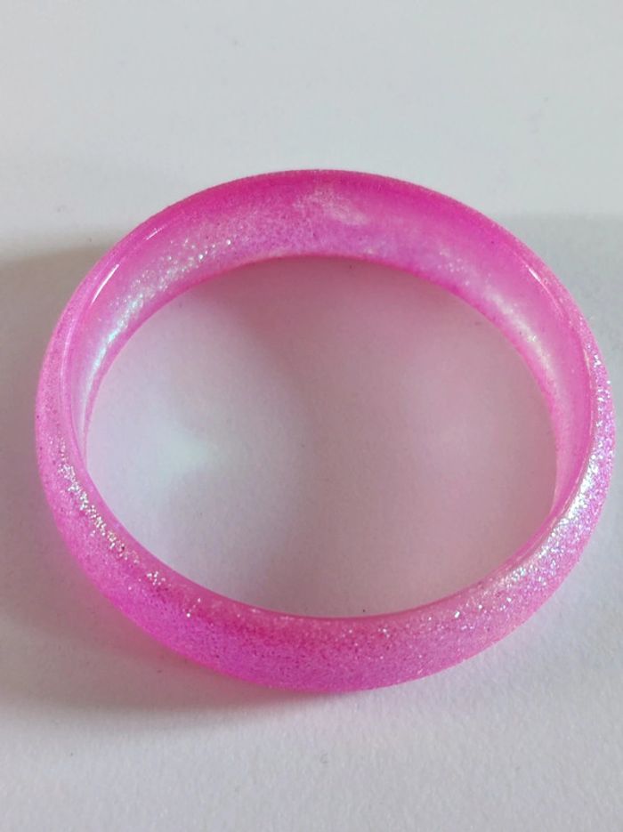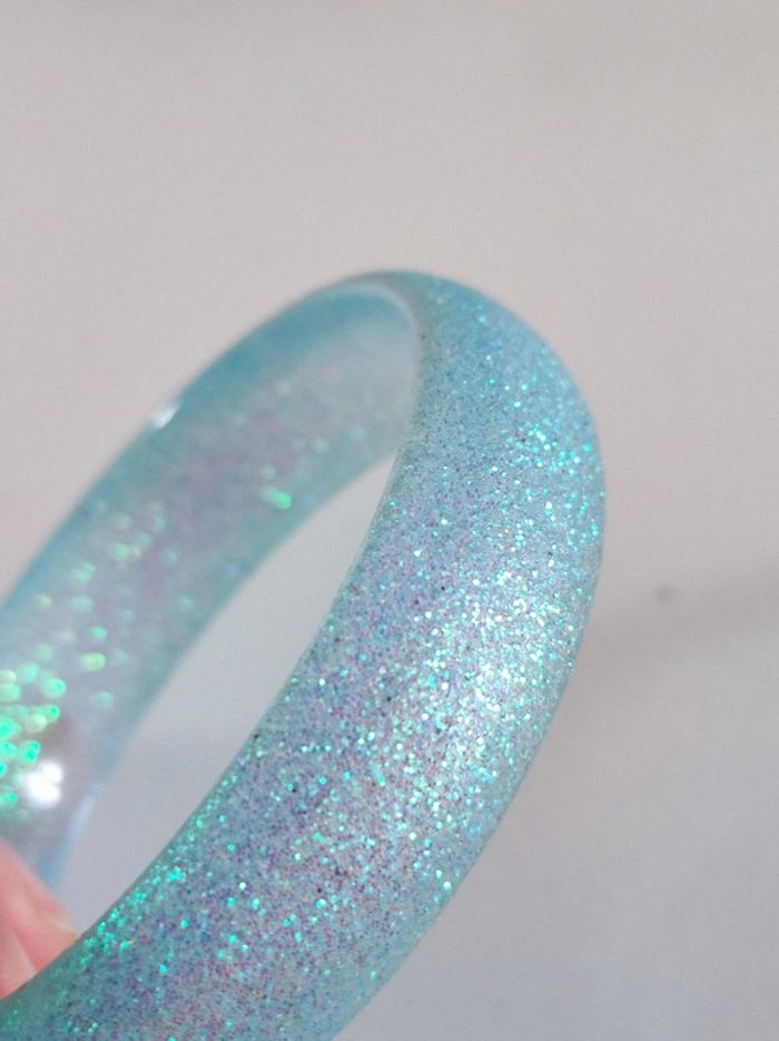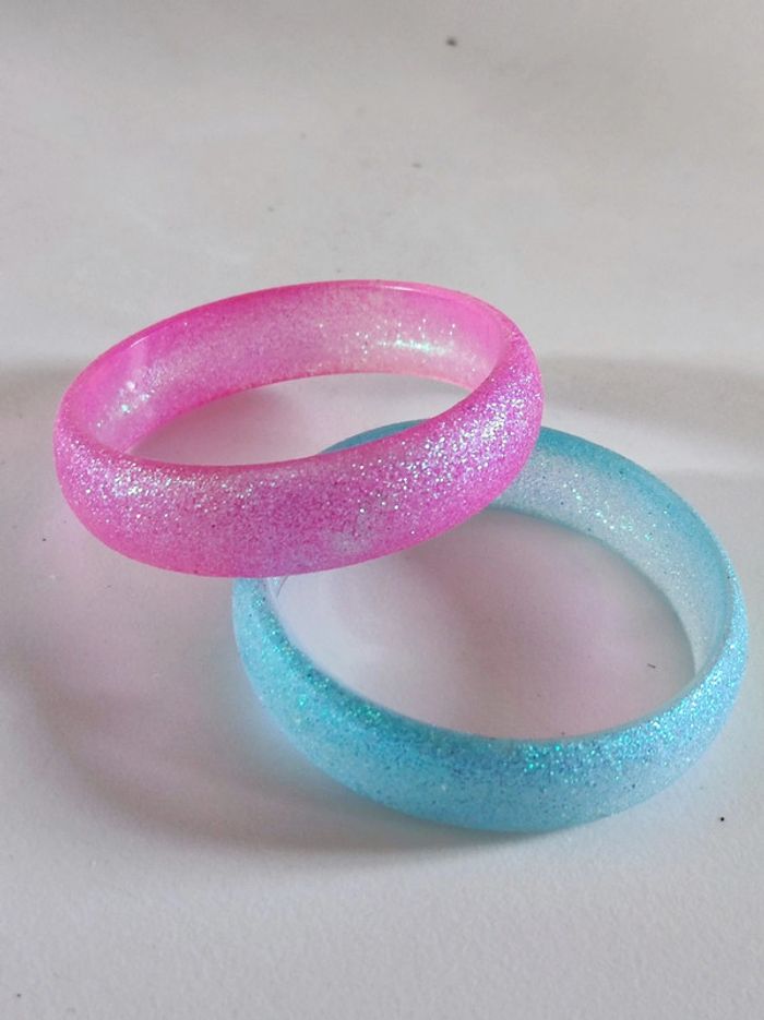 Lot de 2 bracelets enfant En plastique dur / hyper solide 1 coloris bleu clair et un rose. Les deux avec pailletes irisés verte Diamètre 6 cm largeur 1,5 cm Parfait état. Comme neuf.