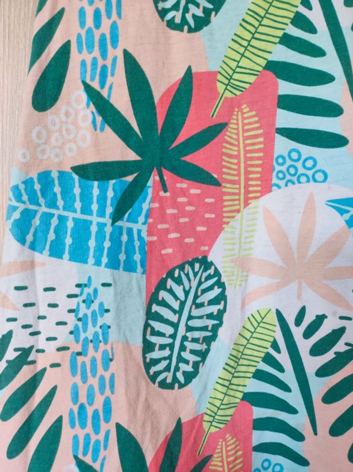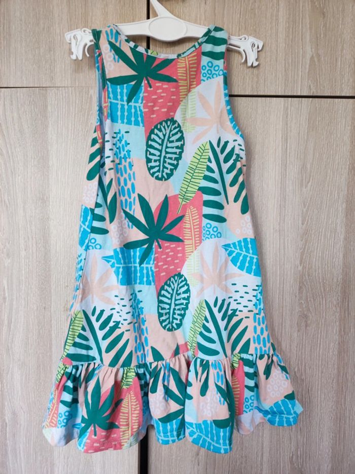 Robe été / estival 6 ans Col rond , sans manches. Coupe droite avec volant. Coloris imprimé feuillages / feuille exotique comme dans la jungle. Couleurs vert , orange, bleu rose. En coton sans étiquette. Très bon etat. Longueur 60 cm #jemholofille6ans