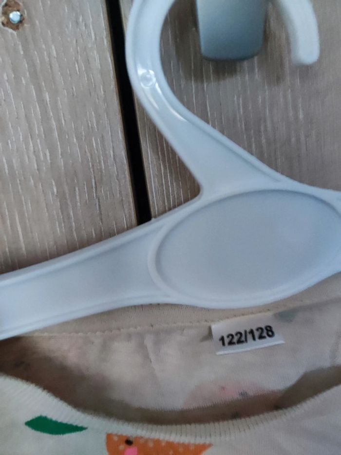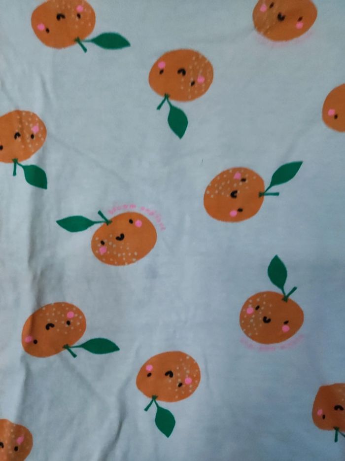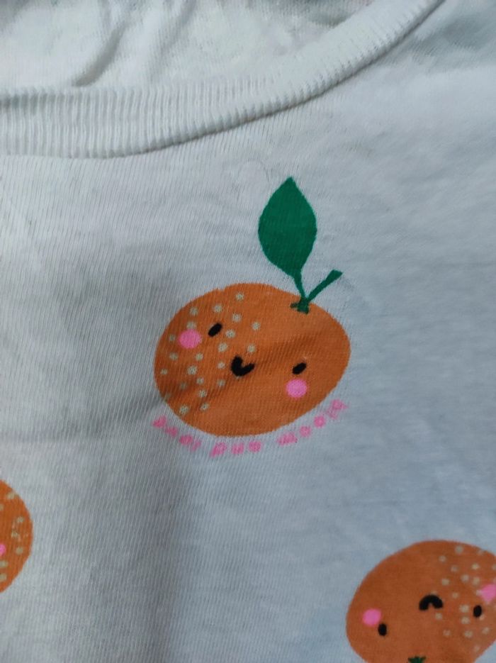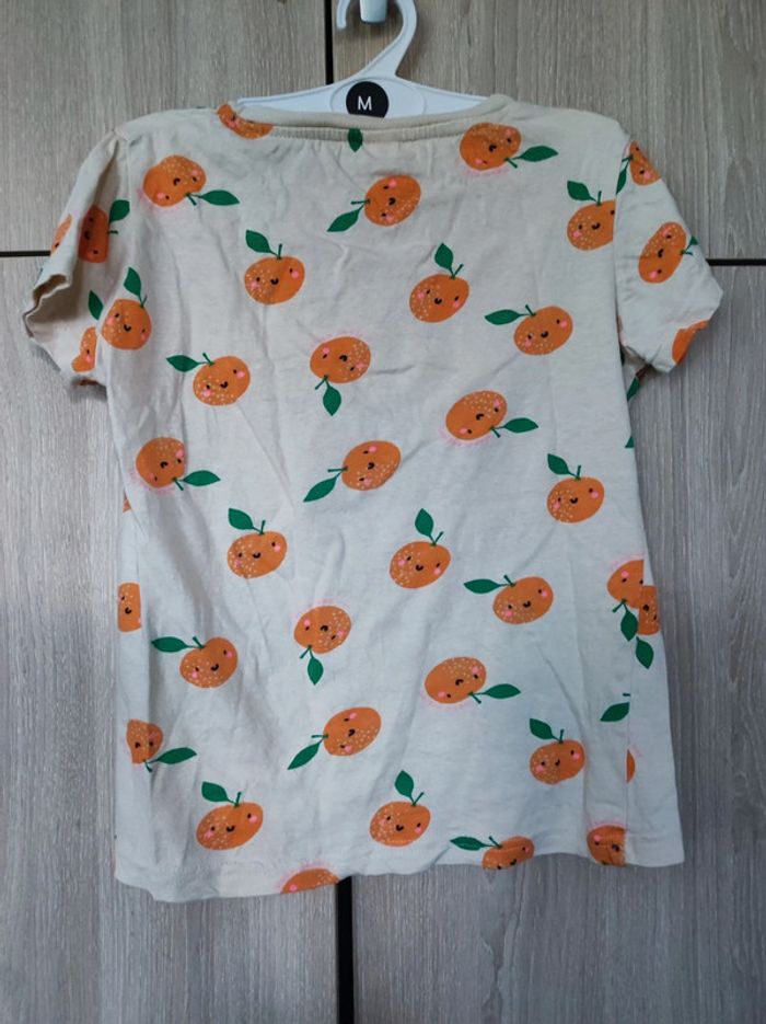 T Shirt 8 ans / 122 - 128 cm Col rond . Coloris rose orangé pâle avec imprimé fruit orange . Écriture rose ' bloom and love'. Petites manches. Parfait etat. En coton . Sans étiquette matière #jemholofille8ans