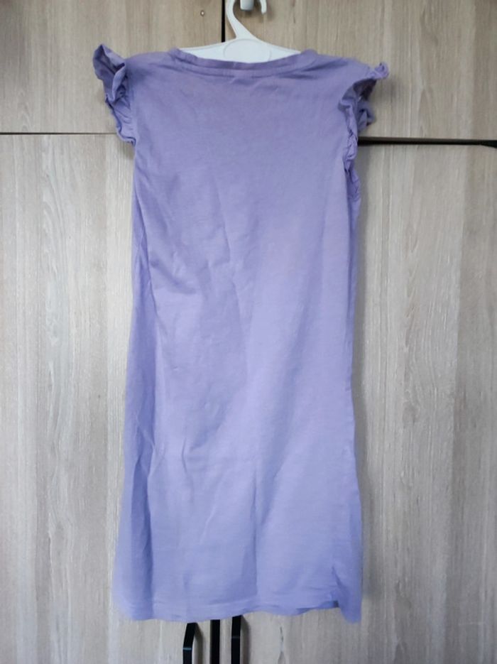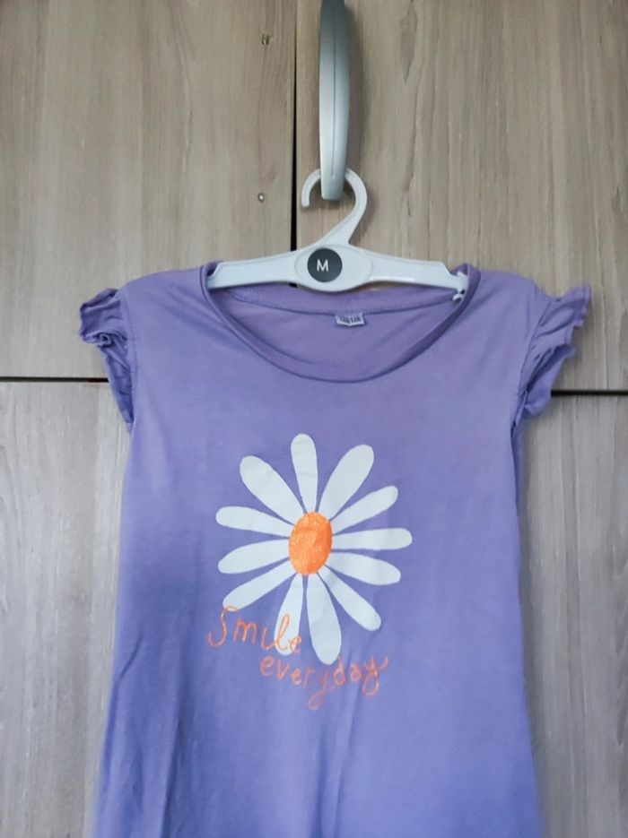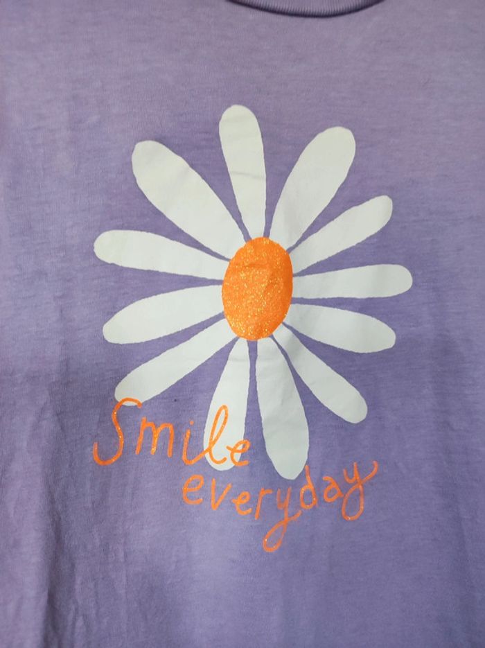 Robe longue été , estival / printemps 7-8 ans / 122 - 128 cm Col rond. Mini manches volants. Coloris uni lilas avec motifs transfert fleur blanche & orange pailleté type marguerite et écriture ' smile everyday ' En coton ( sans étiquette) 68 cm long Parfait etat #jemholofille7ans #jemholofille8ans
