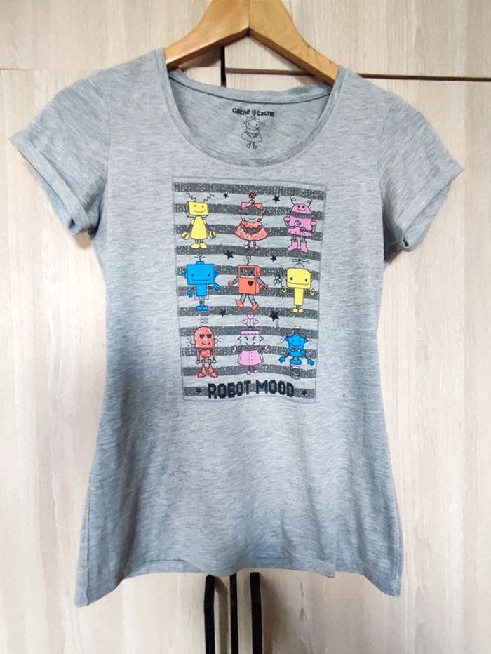 T shirt Marque Cache Cache Taille 1 ( 34 ) / xs Col rond et manches courtes avec rebord Coloris gris clair effet chiné blanc. Imprimé avant sur rayures et étoile style street art avec écriture robot mood et 6 robots mignons : en bleu , jaune , orange , rose , a paillettes rouge type filles , robot a ressort, triangle , rectangle etc Modele vintage annees 90 Parfait etat 67 % polyester, 33 % coton Pour retrouver tout mes articles sans effort de cette même taille : #jemholofemme34