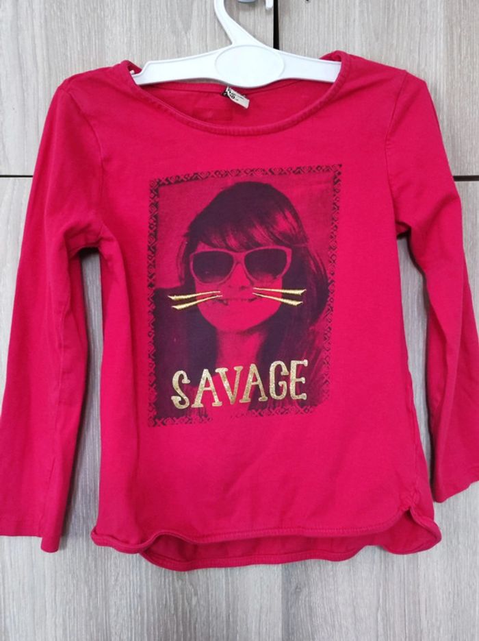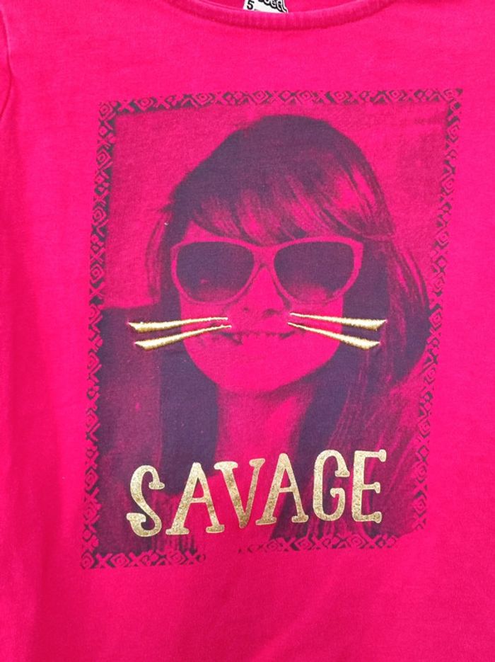 T shirt / top / sweat fin Marque Tape a l'oeil Taille 5 ans / 110 cm Col rond. Manches longues . Coloris rose fuschia avec portrait de fille imprimé en noir avec moustache brodé fil doré et écriture 'savage' pailleté / sauvage. Coupe relevé sur chaque côté. Parfait état. 100 % coton. #jemholofille5ans