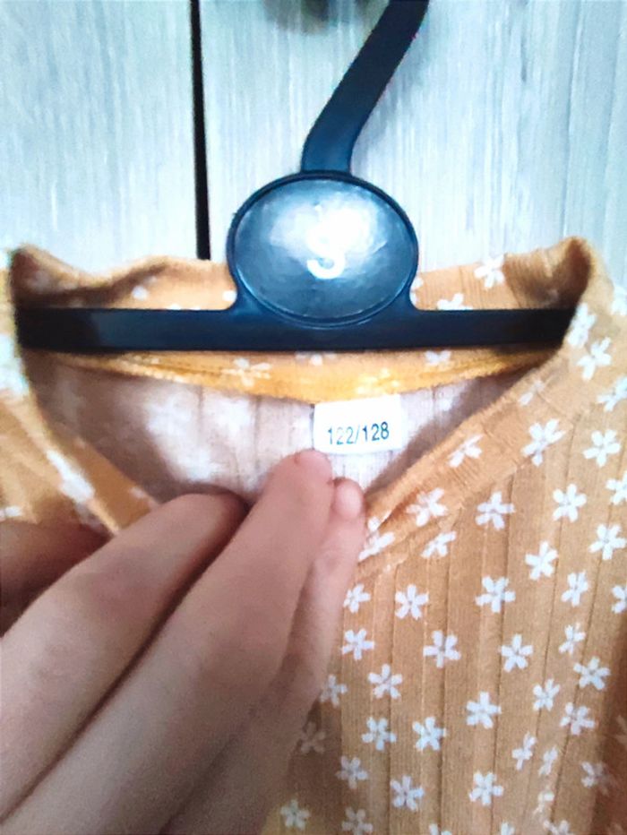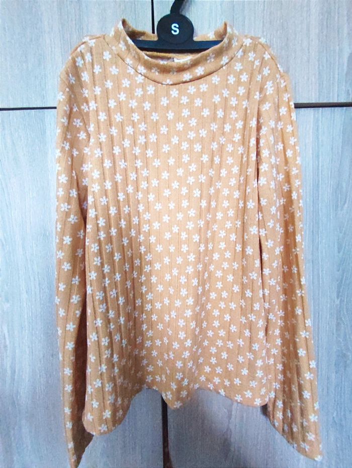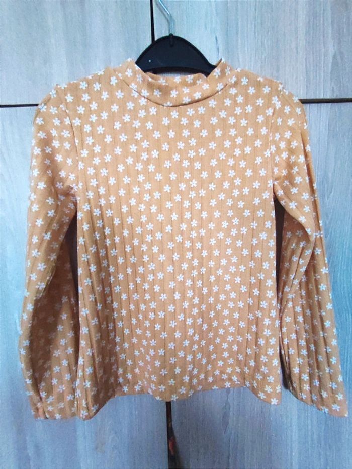 Pull / sous pull ( idéal avec un gilet ) Taille 122 - 128 cm Sans étiquette marque Petit col , manches longues. Côtelé avec imprimé fleur blanche. Coloris jaune moutarde / orange clair Matière fine. Parfait etat #jemholofille7ans #jemholofille8ans