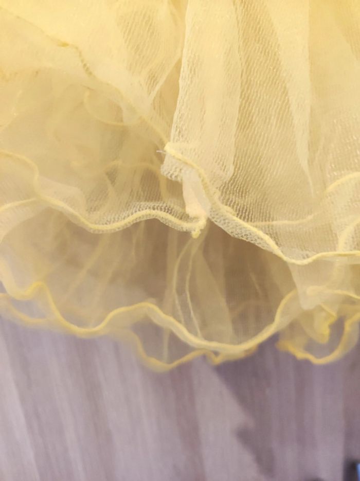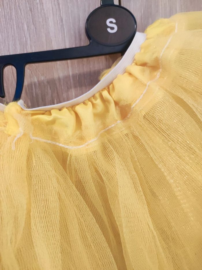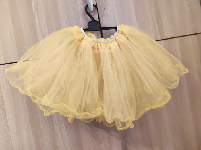 Tutu jaune princesse idéal pour la danse Modèle avec plusieurs niveau Taille elastique et extensible Matière tulle Dimension a plat : 19 cm setend jusqu'à 32 cm Hauteur : 24 cm Parfait état