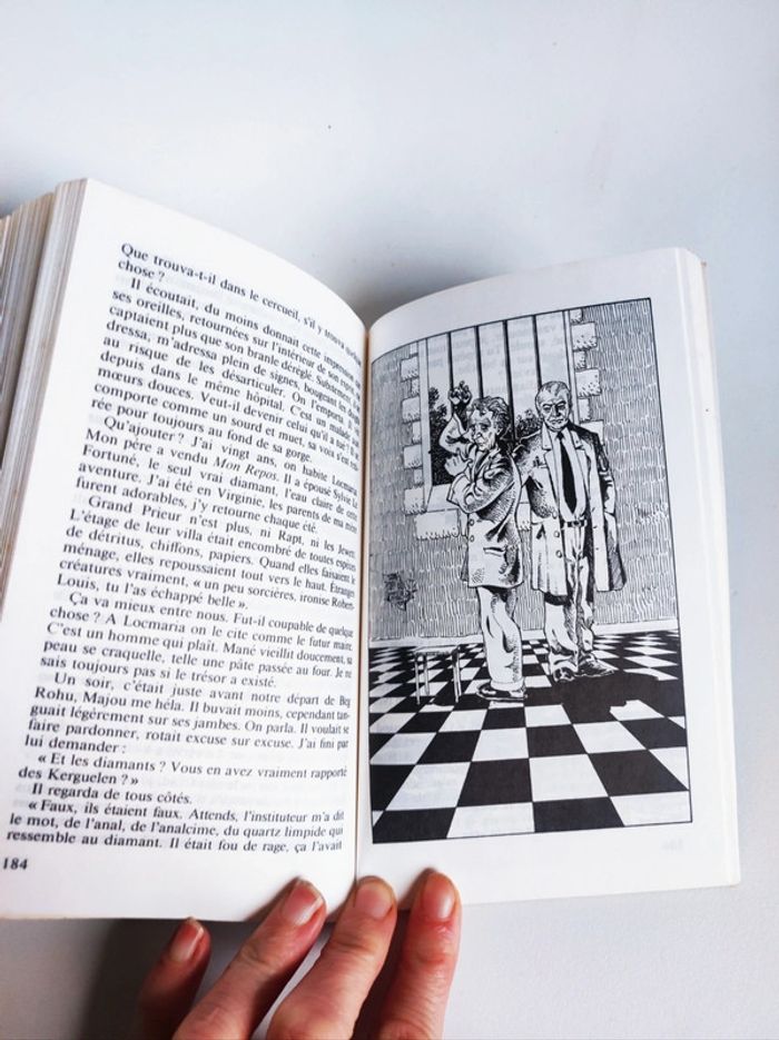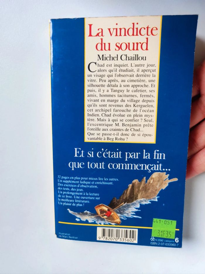 Livre pour les jeunes Titre La vindicte du sourd Auteur : Michel Chaillou Collection folio junior / edition Gallimard 1990 Pages : 187 pages + 32 pages Avec illustrations noir & blanc de Christian Henrich Édition speciale : 32 pages en plus pour mieux lire les autres. Un supplément ludique et enrichissant. Des exercices d'observation, des tests, des jeux. Un prolongement a la lecture, une ouverture pour une lecture plus ludique. Histoire : C had est inquiet. L'autre jour, alors qu'il étudiait, il aperçut un visage qui l'observait derrière la vitre. Peu après, au cimetière, une silhouette détala à son approche. Et puis, il y a Tanguy le cafetier, ses amis, hommes taciturnes, fermés, vivant en marge du village depuis qu'ils sont revenus des Kerguelen, cet archipel farouche de l'océan Indien. Chad évolue en plein mystère. Mais à qui se confier ? Seul, l'excentrique M. Benjamin prête l'oreille aux craintes de Chad... Que se passe-t-il donc de si épouvantable à Beg Rohu ? Très bon etat. Quelques légères marques sur couverture. Interieur impeccable. Quelques Point de vieillissement sur tranches.