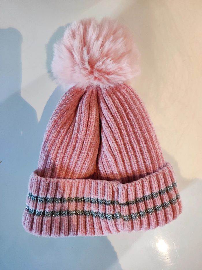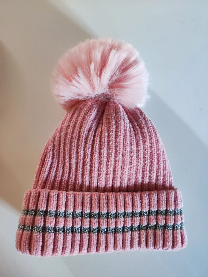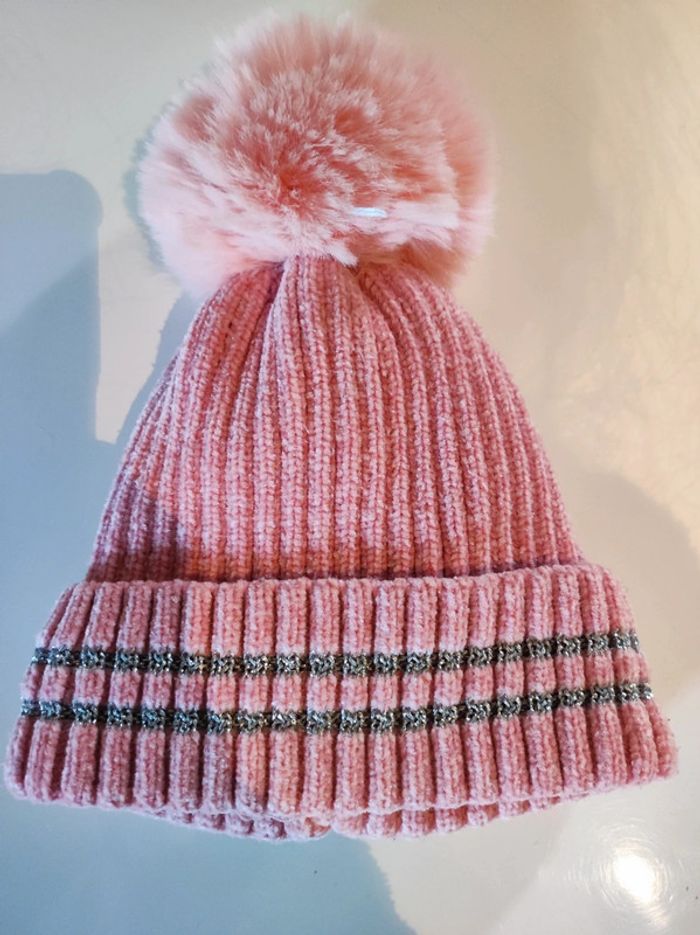 Bonnet hiver à pompons Chaud et matière epaisse & douce Couleurs rose avec 2 bandes fils metalliques brillant argenté effet pailletés Matière : 98 % polyester et 2 % fil metallique Pompon poil rose. 18 cm a plat x 20 cm de hauteur Parfait état. Comme neuf ( porté une fois / prénom nom ecrit sur etiquette a l'interieur au verso )