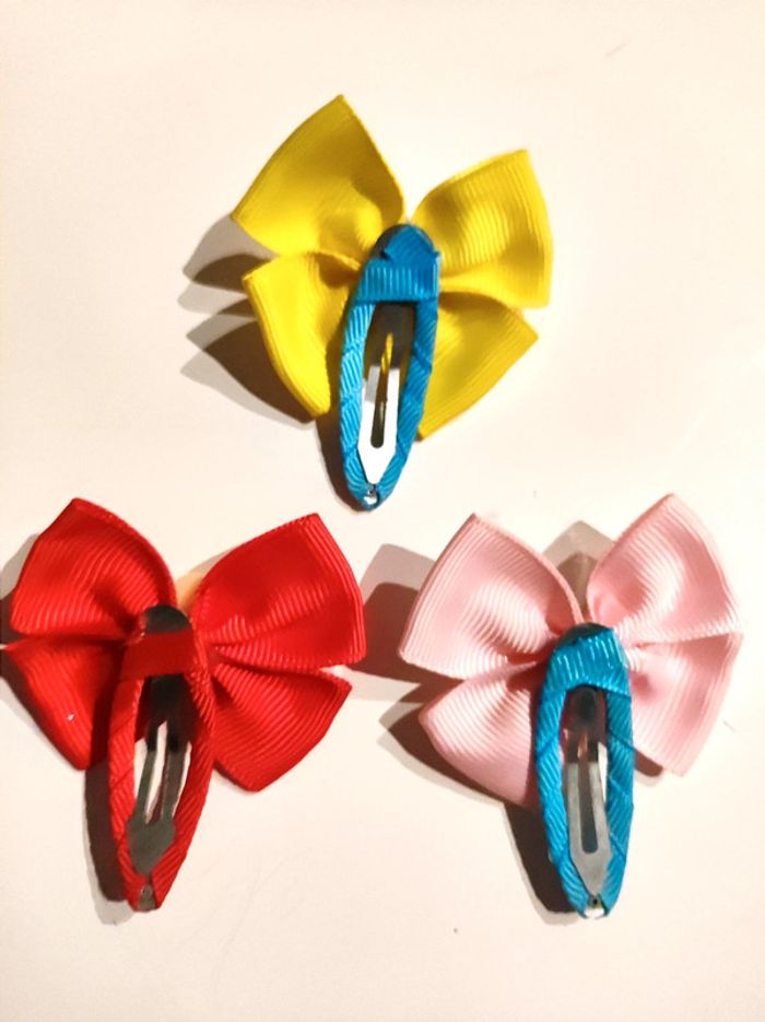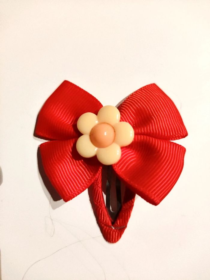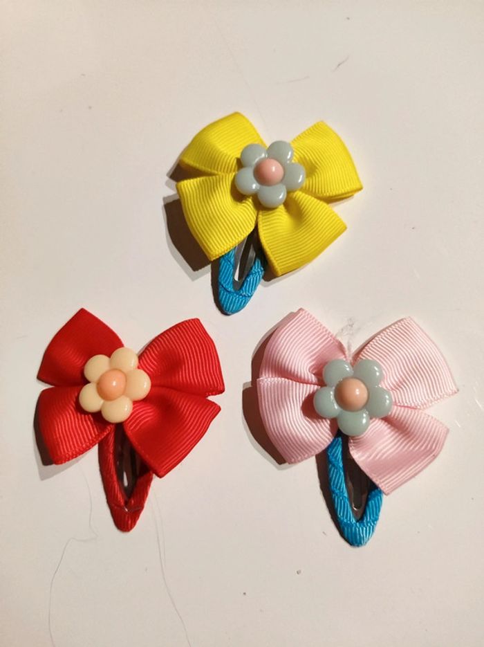 Lot 3 pinces a clipser Accessoire cheveux pour enfants Noeud papillon rose, jaune er rouge. Au centre une fleur en perles nacrées grise et rose pale. Pince décoré de tissus bleu et rouge. Format : 6 cm x 5 cm Parfait état