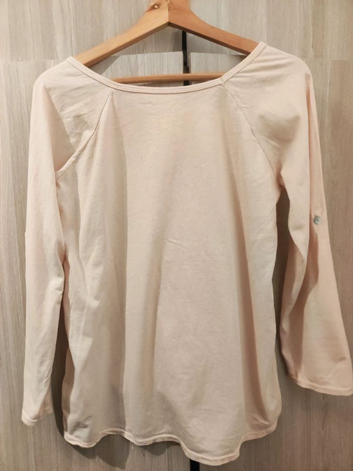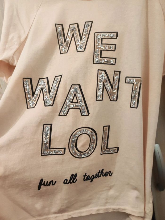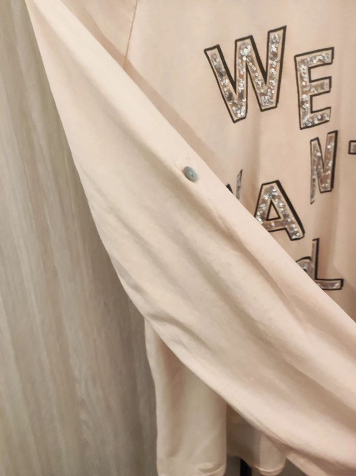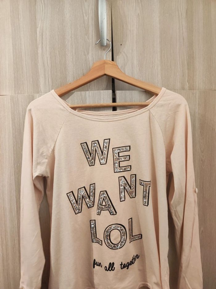 Pull fin / tee shirt manches longues Taille 40 Marque italienne made in italy Col rond, manches longues. Ecriture fantaisie 'we want lol ful all togerher' avec strass argenté et imprimé noir. Coloris rose pale Coupe originale : plus long a l'arrière. Encolure large. Manches retroussables. 100 % coton Parfait état Pour voir les autres articles de mon dressing dans cette même taille : #jemholofemme40