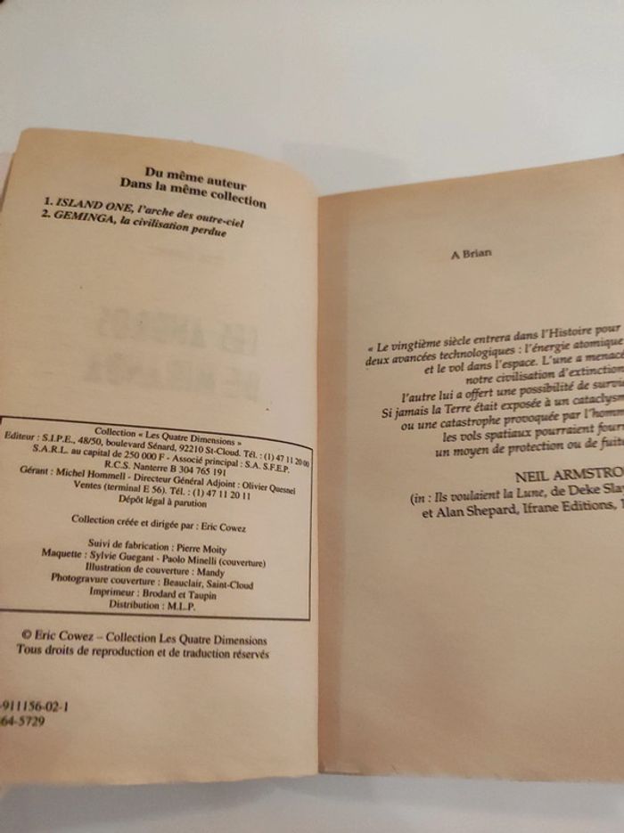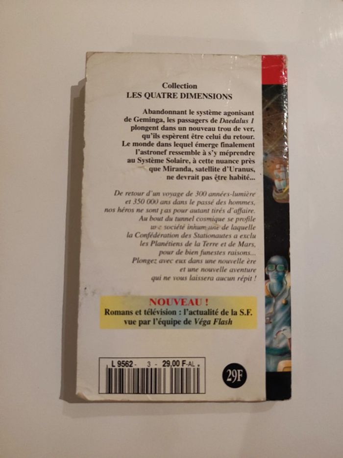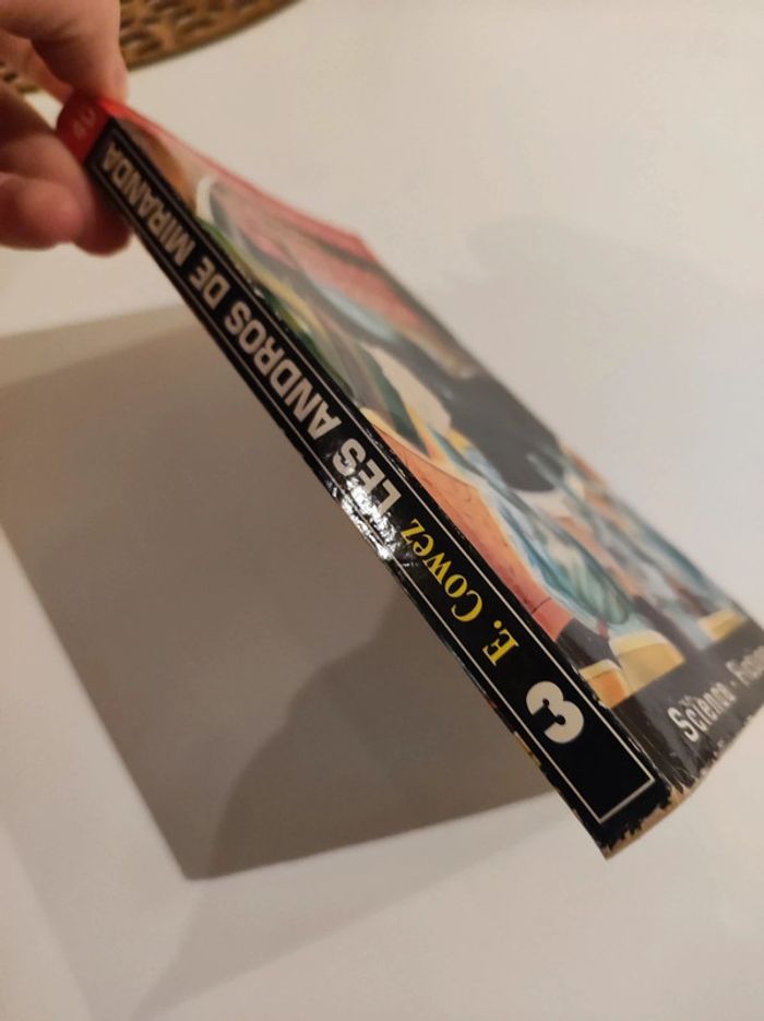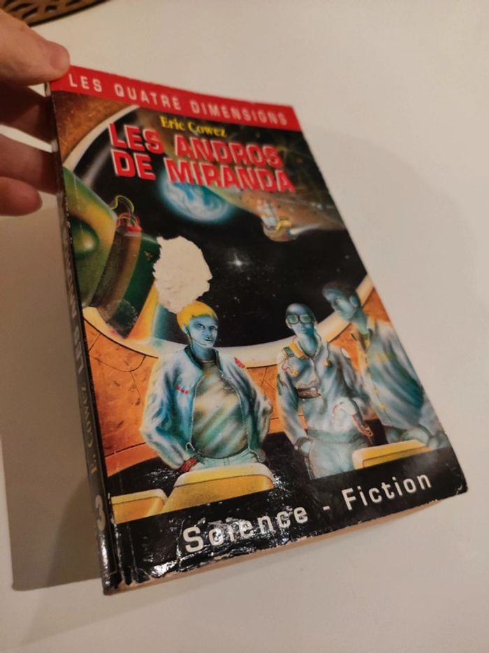 Livre de science - fiction Collextion Les quatre dimensions Titre : les andros de miranda Auteur : Eric cowez 182 pages. Broché. Couverture souple cartonné Histoire : Abandonnant le système agonisant de Geminga, les passagers de Daedalus 1 plongent dans un nouveau trou de ver, qu'ils espèrent être celui du retour. Le monde dans lequel émerge finalement l'astronef ressemble à s'y méprendre au Système Solaire, à cette nuance près que Miranda, satellite d'Uranus, ne devrait pas être habité... De retour d'un voyage de 300 années-lumière et 350 000 ans dans le passé des hommes, nos héros ne sont pas pour autant tirés d'affaire. Au bout du tunnel cosmique se profile une société inhumaine de laquelle la Confédération des Stationautes a exclu les Planétiens de la Terre et de Mars, pour de bien funestes raisons...plongez avec eux dans une nouvelle ère et une nouvelle aventure qui ne vous laissera aucun répit ! Interieur frais ( pages teintes papier jaune) Couverture avec imperfections : marques de pliures, frottement et cornes.