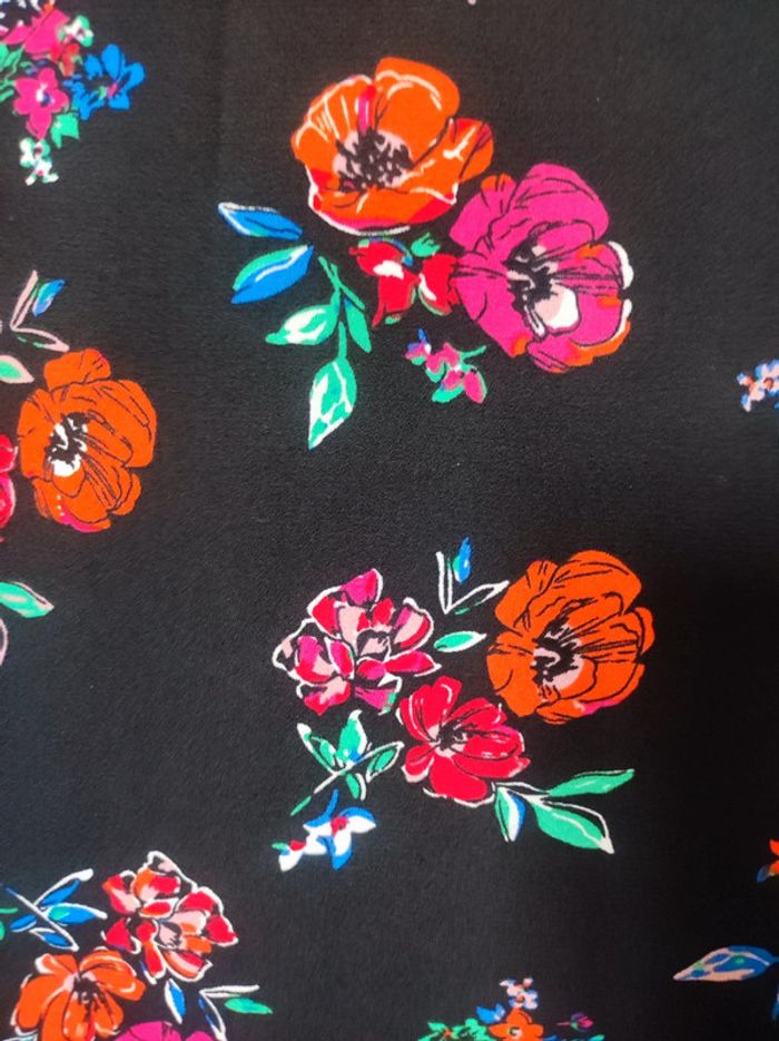 Robe fleurie Marque Blancheporte T 50 - grande taille Robe a manches longues 3/4 Col v arrondi, manches ouvertes sur le dessus, évasée comme kimono et fermées par un noeud. Matière : 100 % polyester Couleurs noir motifs fleurs orange et rose . Longueur : 98 cm Mesure a plat aisselle a aisselle : 62 cm Parfait état, comme neuve. Pour voir les autres articles de mon dressing dans cette même taille : #jemholofemme50
