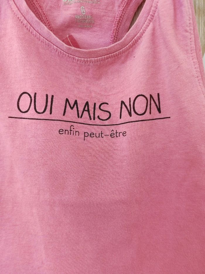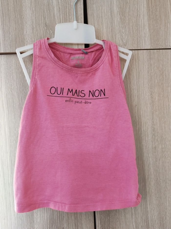 Debardeur été/ estival Marque orchestra Taille 6 ans Modèle rose sans manches. Inscription écriture noir a l'avant : oui mais non enfin peut être. Ideal pour les enfants indécis ! Col rond. Longueur 37 cm. Parfait etat. Manque juste etiquette matière. #jemholofille6ans