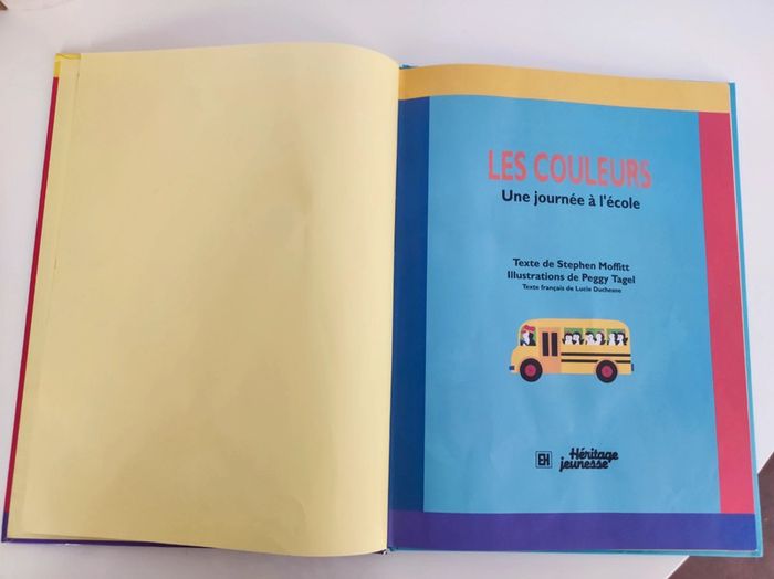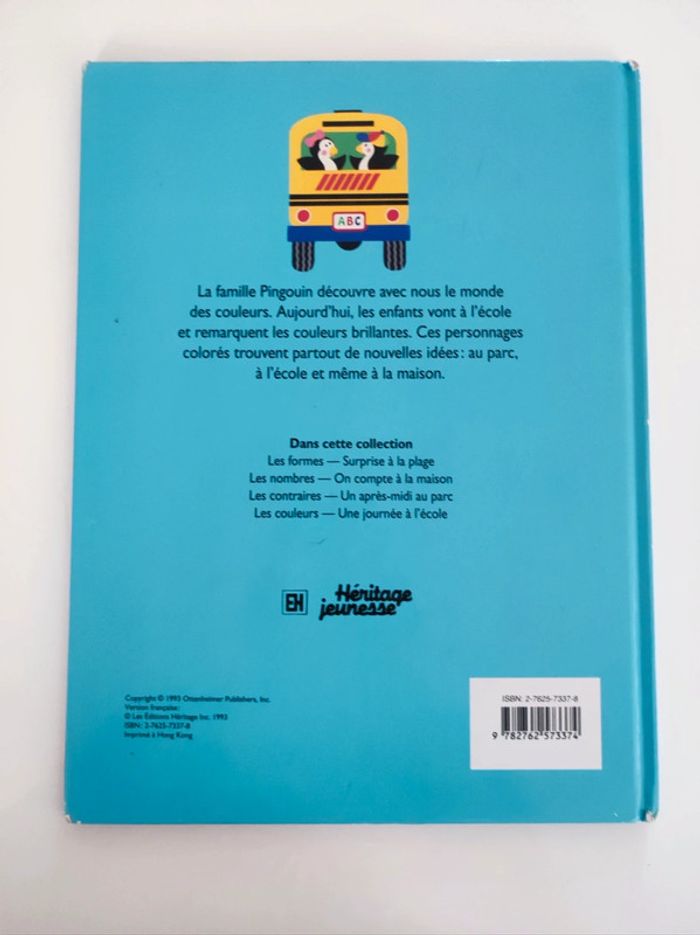 Livre enfant Les couleurs / une journée a l'école La famille pingouin Edition héritage EH / heritage jeunesse 1993 Imprimé a hong kong Format 23,5 x 31 cm Exterieur legeres imperfections sur les coins Intérieur impeccable / 16 pages couleurs Couverture rigide cartonnée Résumé : la famille pingouin découvre avec nous le monde des couleurs. Aujourd'hui les enfants vont a l'ecole et remarquent les couleurs brillantes. Ces personnages colorés trouvent partout de nouvelles idees : au parc, a l'école et même a la maison.