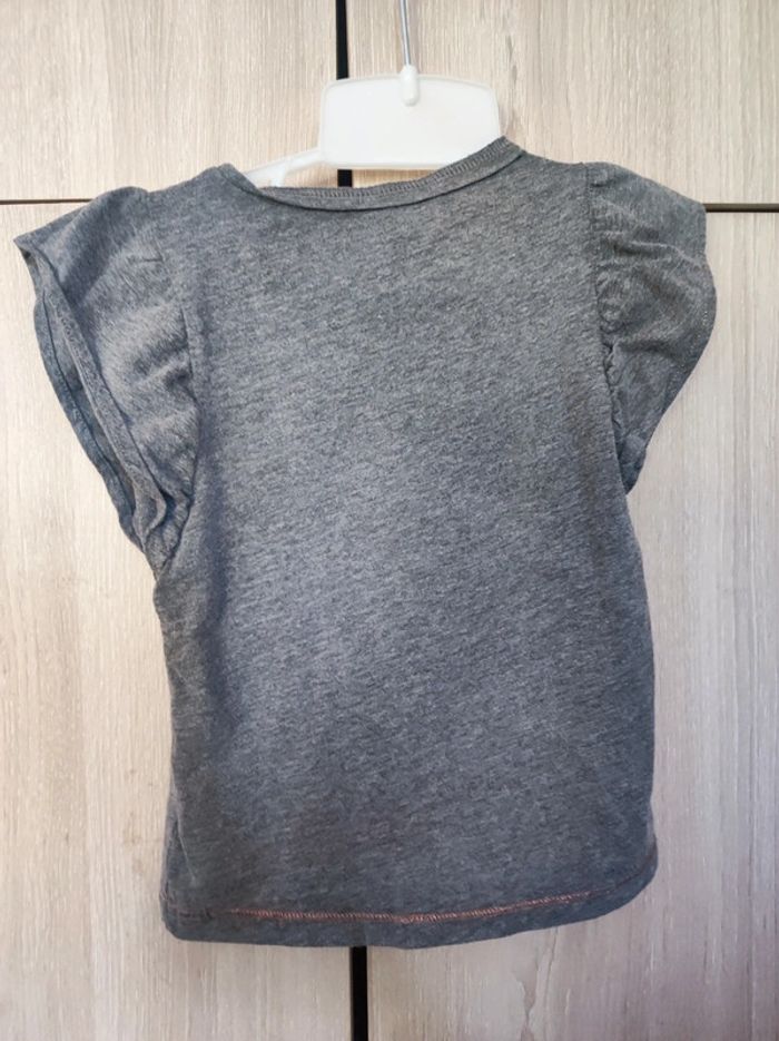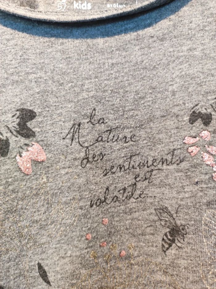 T qhirt été/ estival Marque Gemo Taille 5 ans Style romantique Couleurs uni gris. Motifs comme dessin très fin d'abeille, fleur, papillon en gris foncé et doré. Paillette rose par endroit. Ecriture fine ' la nature des sentiment est volatile ...' Col rond petites manches a volants. Parfait état. 51 % coton, 49 % polyester. #jemholofille5ans