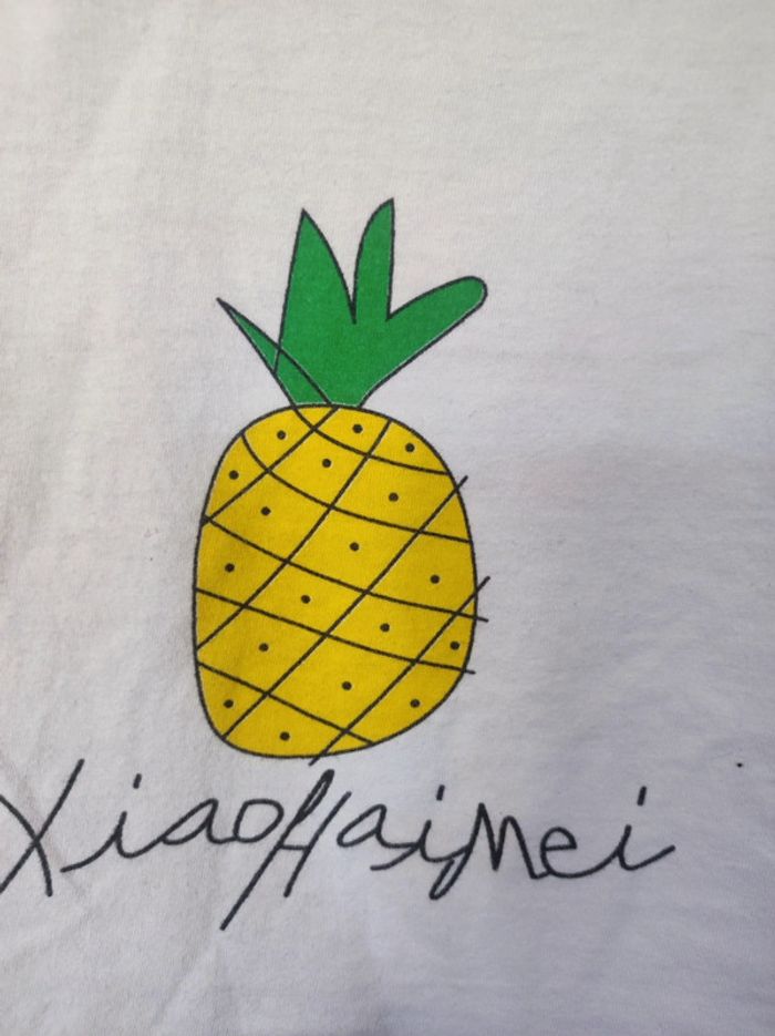Débardeur/ t shirt sans manches 110 cm / 5 ans Blanc avec bordures rose clair. Motif dessin imprimé ananas + écriture ananas écrit en chinois. 97,5 % coton / 2,5% polyester Parfait état #jemholofille5ans
