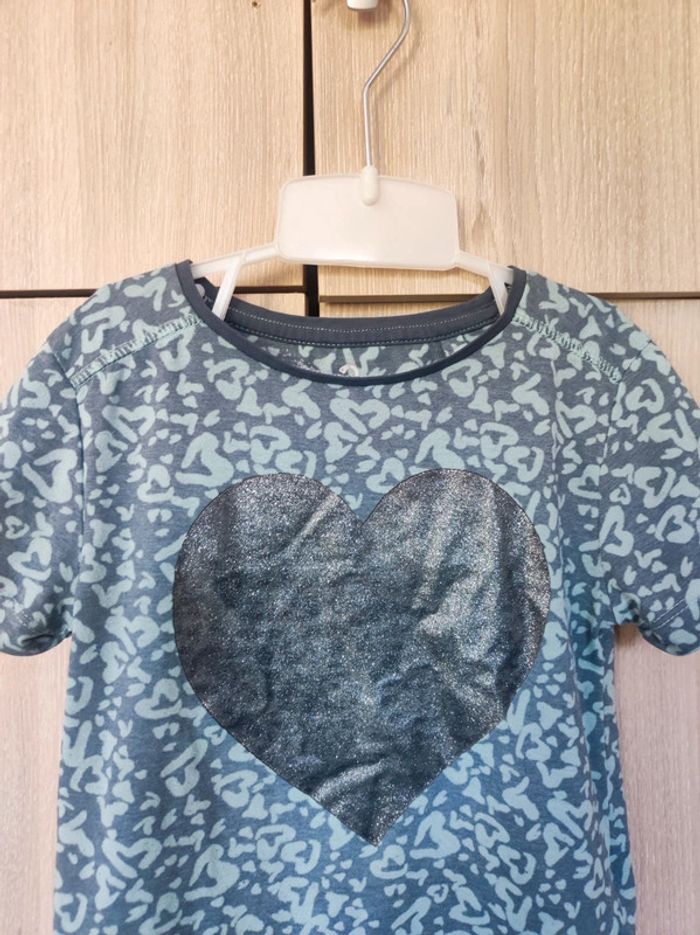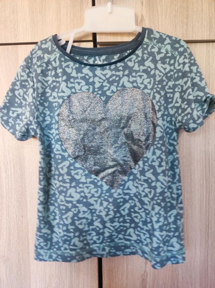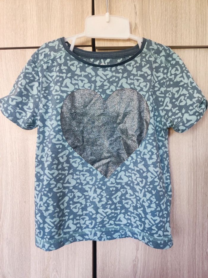 T shirt imprimé Marque Palomino de c&a Taille 6 ans ( étiquette coupée) 100 % coton. Col rond. Motif imprimé coeur bleu clair. Grand coeur a paillettes argentées a l'avant. Petites manches. Parfait état. #jemholofille6ans