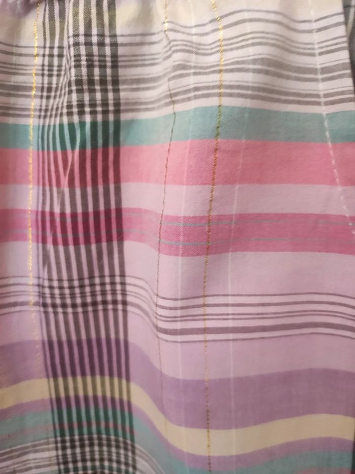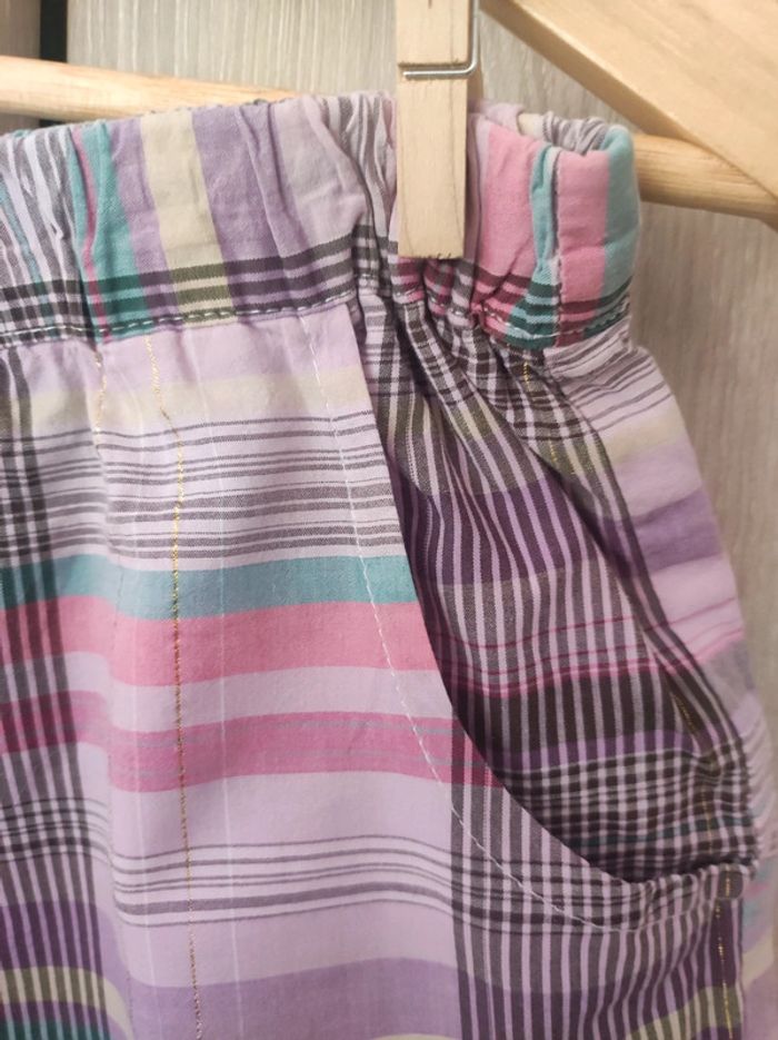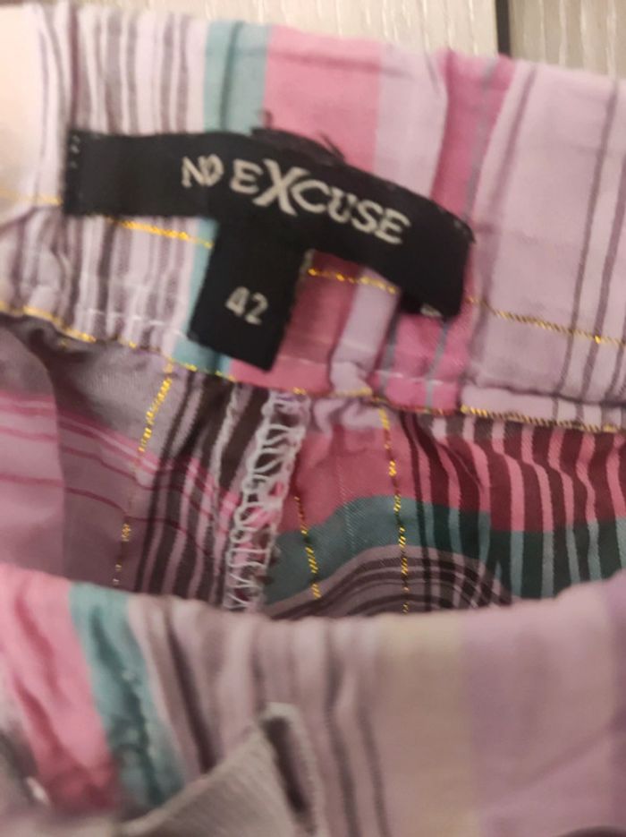 Mini short de nuit Taille 42 Marque No excuse. Imprimé carreaux effet vintage / retro Multicolore dominante violet ( avec , rose , jaune, vert, gris avec couture dorée ) Faux système fermeture boutons nacrés beige a l'avant. 2 poches avant discrète. Taille élastique. Cordon en satin gris brillant pour régler. Parfait état. Pour voir les autres articles de mon dressing dans cette même taille : #jemholofemme42