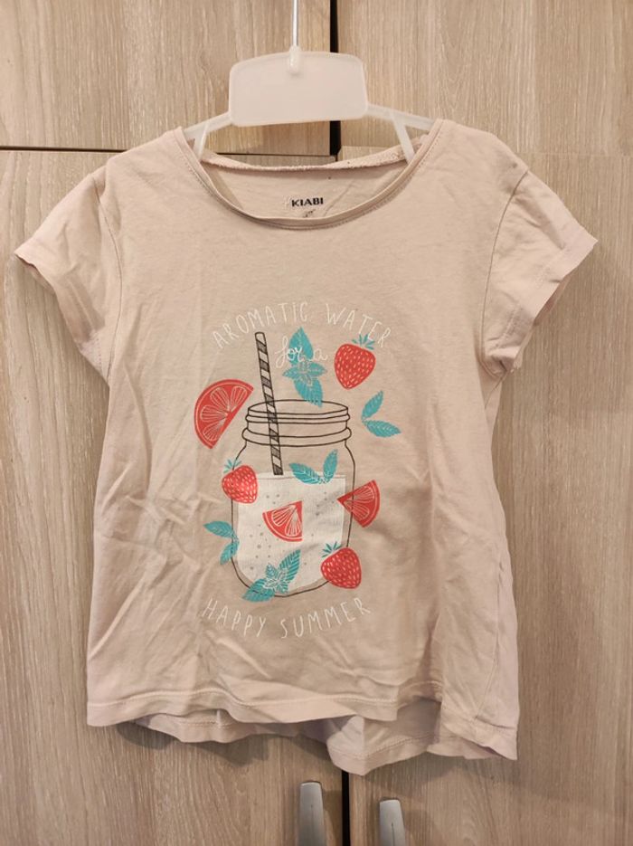 T shirt été / estival Marque kiabi 5 ans 100 % coton. Col rond , petites manches. Imprimé boisson aux fruits type smoothie avec motif fraise, agrumes et menthes. Couleurs rose pâle. Style rétro. Imperfection : mini craquelure sur imprimé quasi invisible comme sur photo. #jemholofille5ans