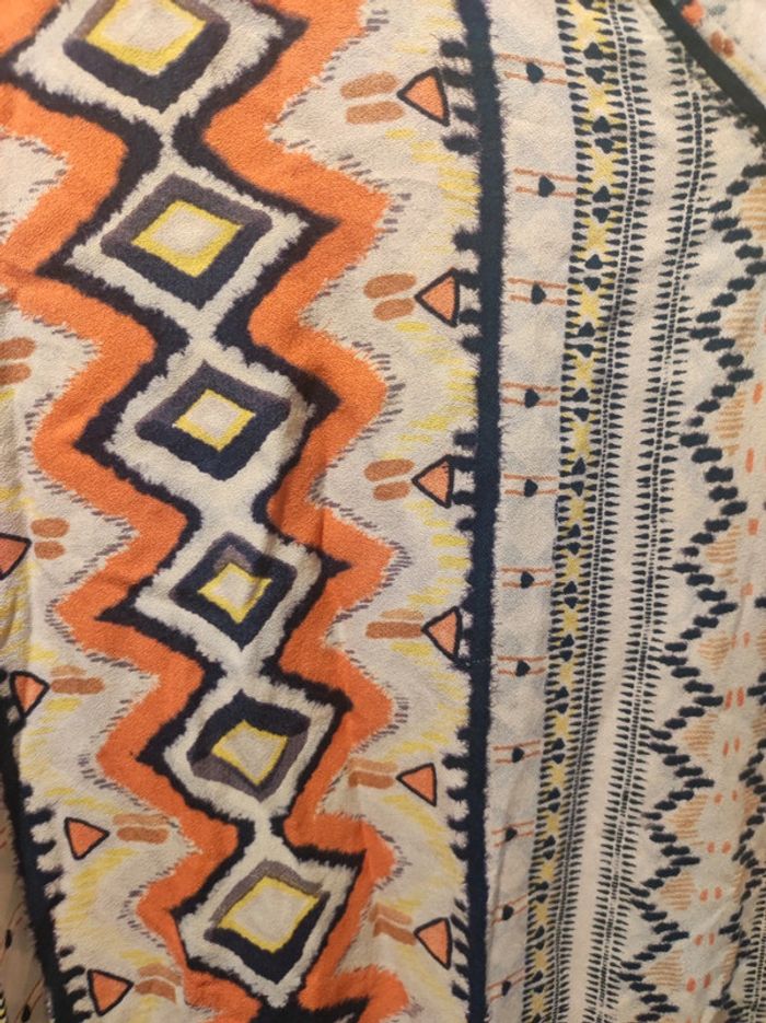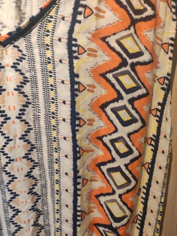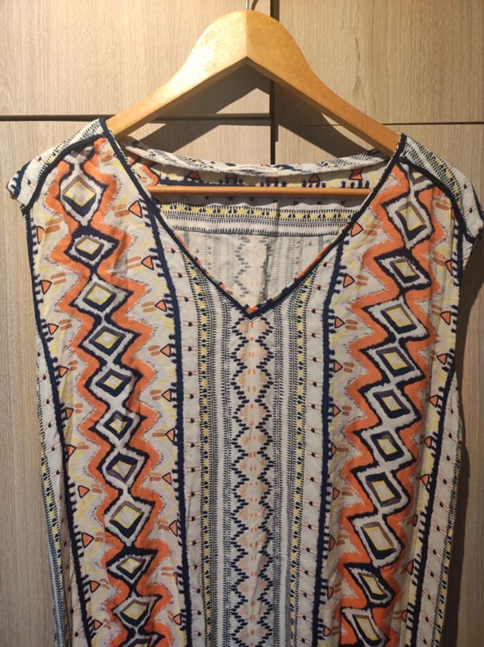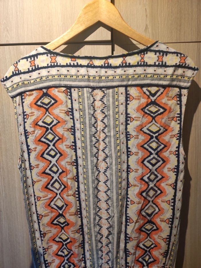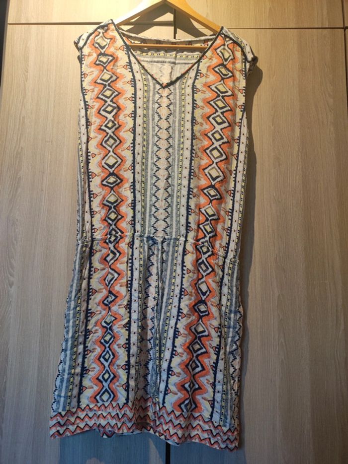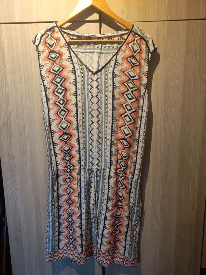 Robe imprimé ethnique Taille 42 Marque Promod. Longueur 96 cm. Peut se resserrer a la taille grâce a un cordon en tissus. Coupe fluide et légère. Col V / sans manche. Possède des poches sur les côtés. couleur fond blanc avec motifs géométrique noir et orange. 100 % viscose. Pour voir les autres articles de mon dressing dans cette même taille : #jemholofemme42 Parfait état comme neuve.