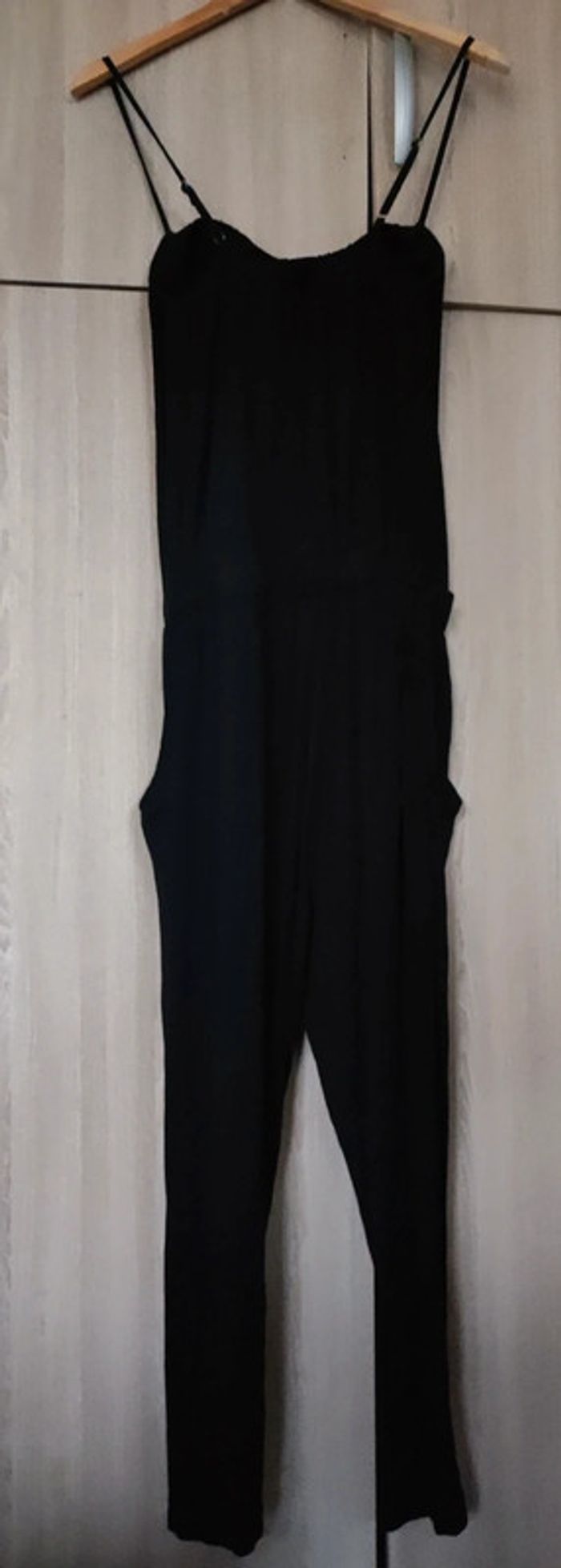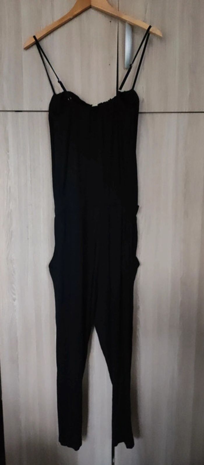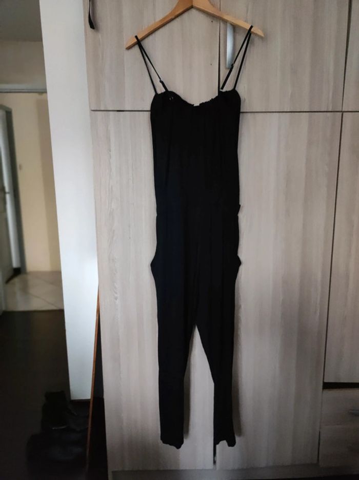 Combinaison noir Pantalon lié a un haut type debardeur a fine bretelle. Marque mystic Taille 40 Coupe fluide avec bandeau au niveau taille. 2 poches discrètes de chaque côté. Bretelle reglables. Col rond. Très bon état. En viscose et elasthane. Pour voir les autres articles de mon dressing dans cette même taille : #jemholofemme40
