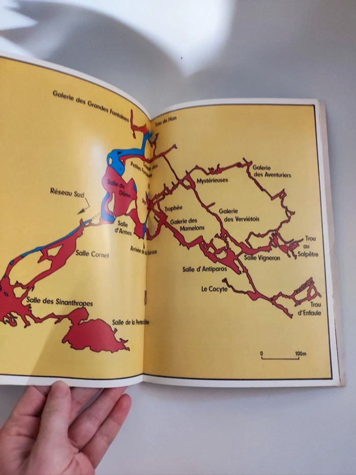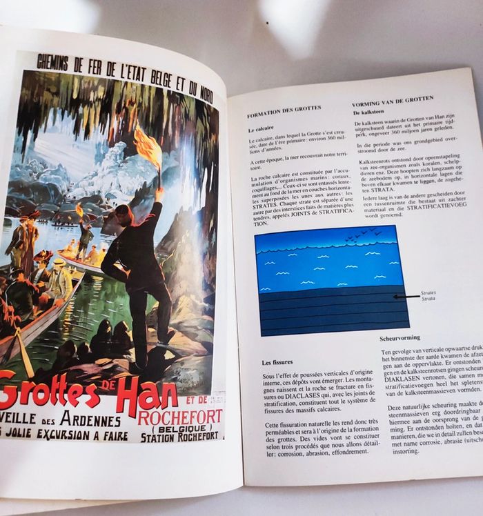 Livre guide tourisme La grotte de Han / de grot van han Han-sur-lesse belgique - belgie Edition thil 1992 Bilingue : français et allemand / Deutsche ( Isbn application fausse : ouvrage non référencée) 40 pages illustrées par des photos, schemas explicatifs, carte de la grotte et de ses salles intégrées En couleurs. Format 24 x 17 cm. Couverture rigide plastifiée. Imperfections : pages jaunies par le temps, micro traces frottements couverture. Trzs bel état