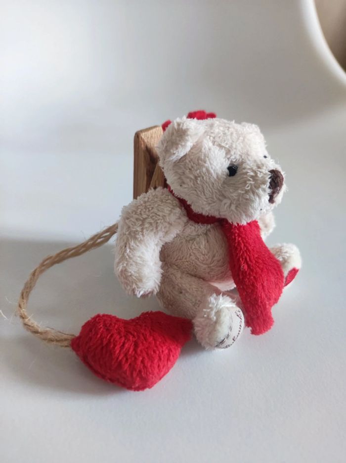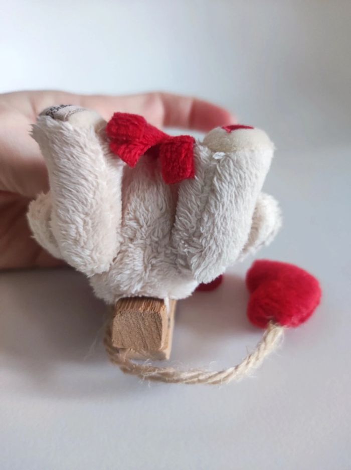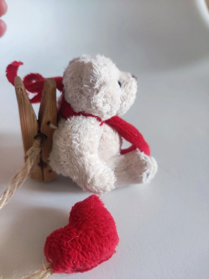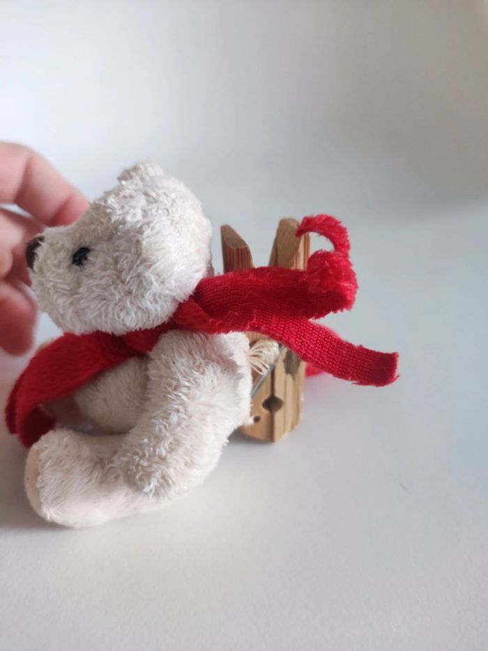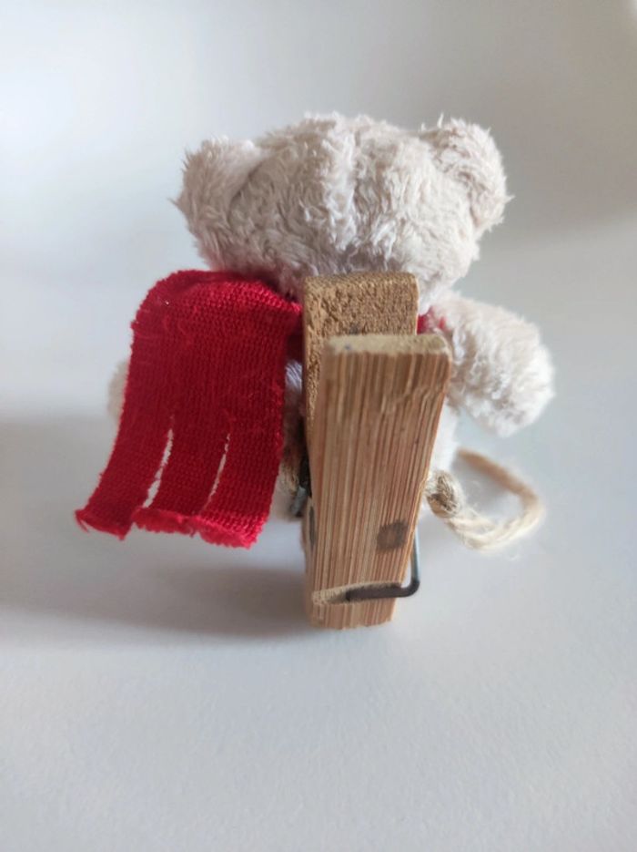 Pince mini peluche ourson Avec coeur et echarpe Marque suedoise Bukowski (etiquette dessous du pied) Taille en hauteur 7 cm Système d'accroche pince a linge Couleurs beige et rouge. Matiere toute douce.