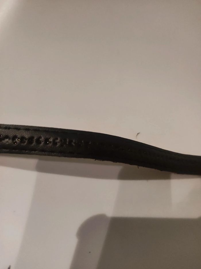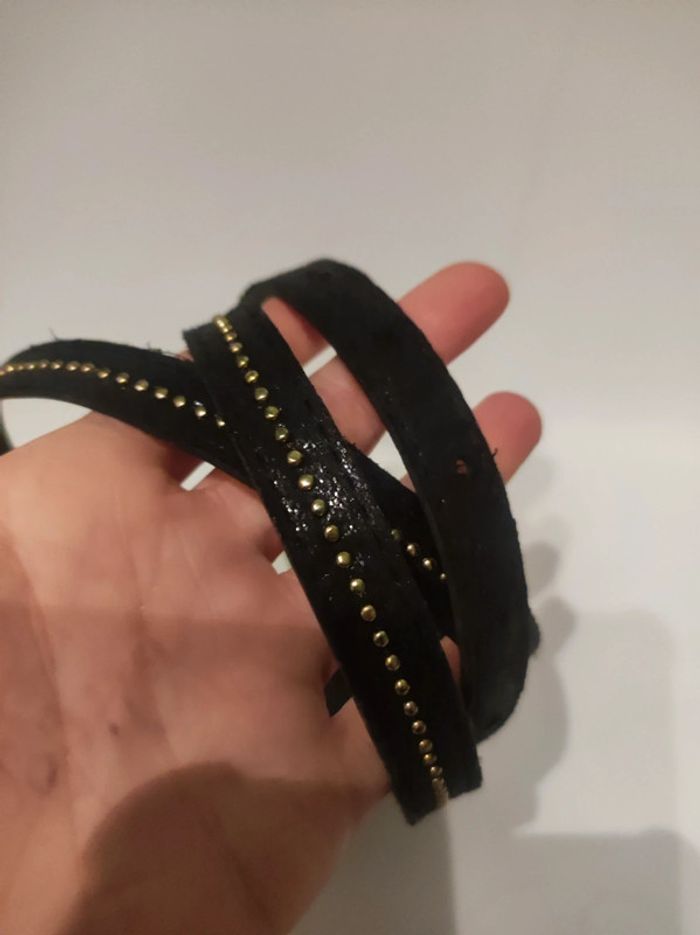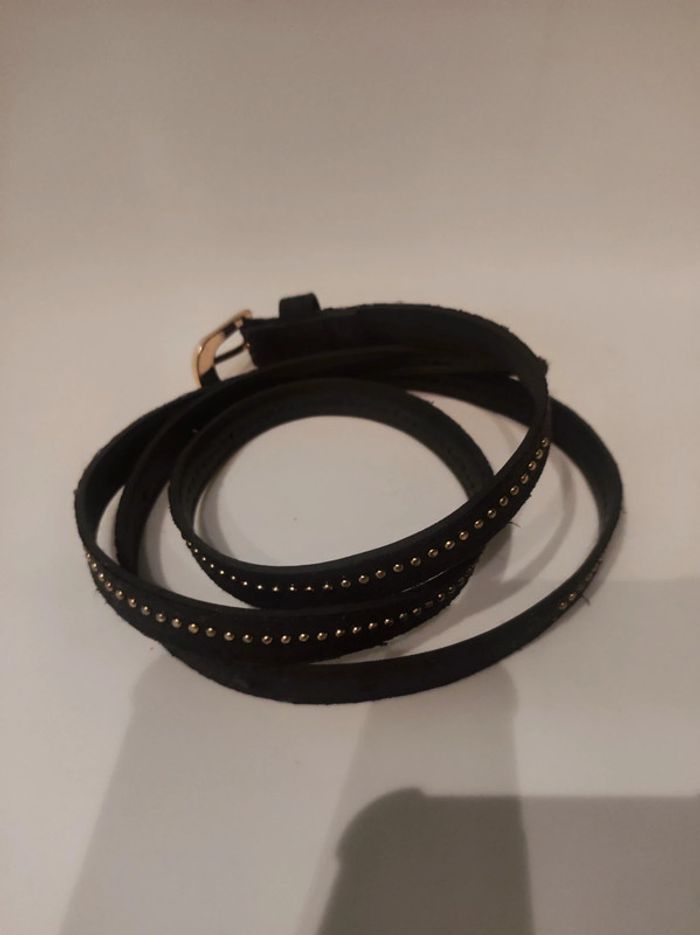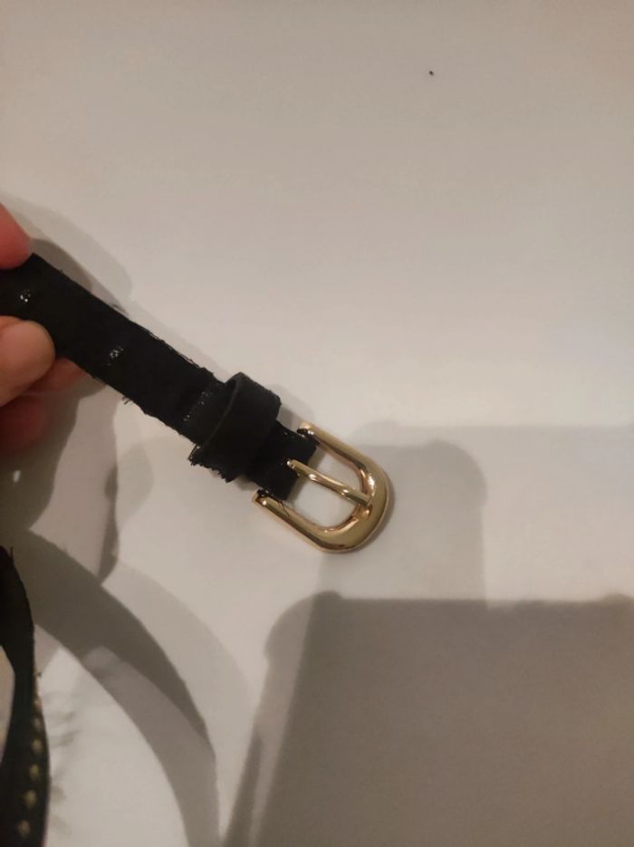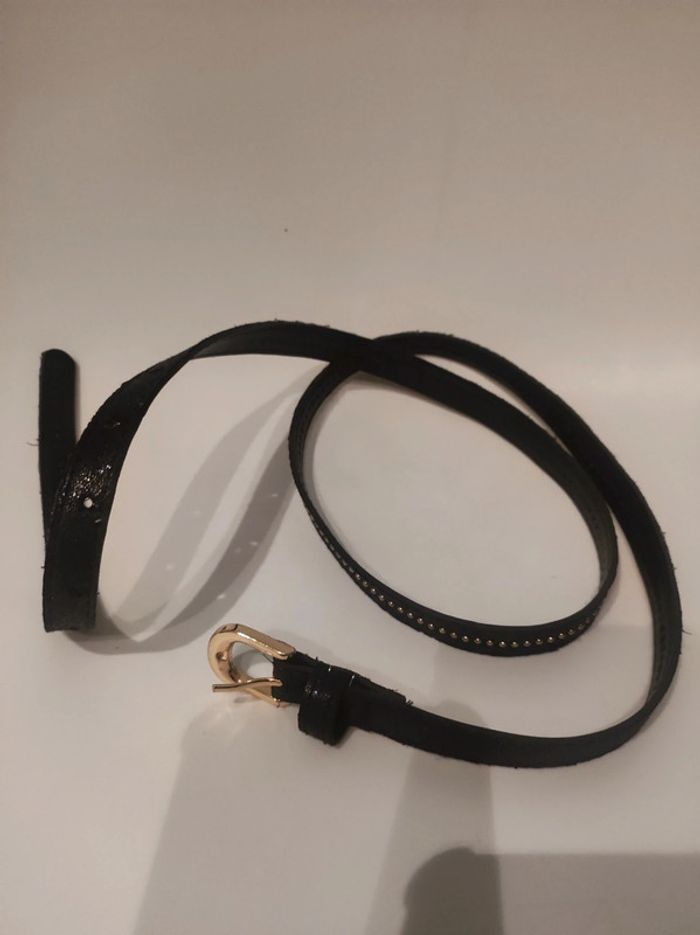 Ceinture aspect cuir (synthétique) Modele couleurs marron foncé (presque noir) avec paillettes dorees et petit clous metal doré. Boucle dorée. Longueur 109 cm. Largeur 1,5 cm Parfait etat.