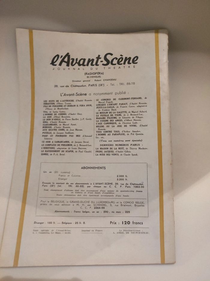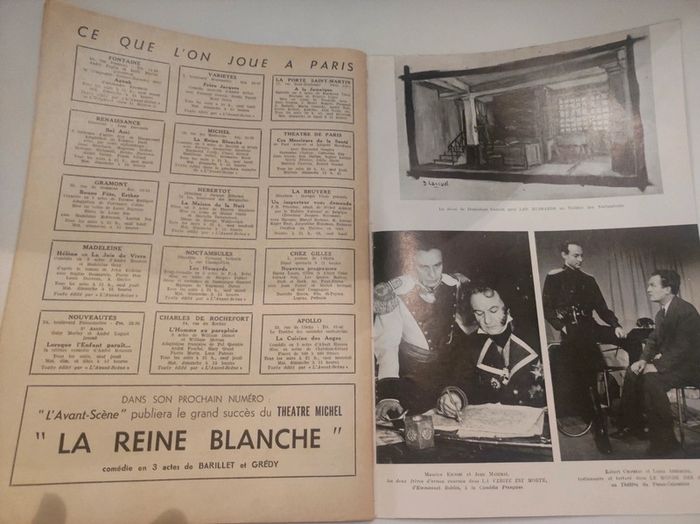 Revue / journal du théâtre ancienne / vintage L'avant scène n°86 de 1954 Théâtre des noctambules , piece integrale Les hussards cie jacques fabbri et rose varte. Format 26,5 x 18 cm. / 41 pages. Sortie par le bureau de la revue. Une revue comportant des pièces de théâtre intégrales avec les détails des mises en scènes, des textes sur les acteurs , les coulisses, les metteurs en scènes, des articles, Des photos en noir et blanc d'acteurs (Joseph Lippi, , jacques fabbri, rosy varte, jacques grello, maurice escandre...), des critiques, et une mise en avant des sorties théâtre de l'époque. Sommaire : - les hussard de cie jacques fabbri - pièces a louer... Et à blâmer par André Camp - le royaume des cabarets par Jacques g Perret Très bon état ! Interieur impeccable. Imperfections : pages jaunies par le temps. quelques marques sur la couverture. Dont une petlte rature rouge. Couverture jaune avec une illustration de Jean Colin. Isbn ne correspond pas tout a fait. Livre ancien