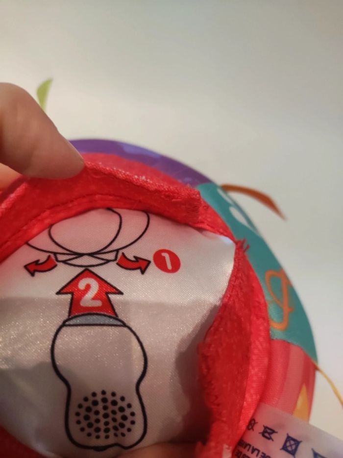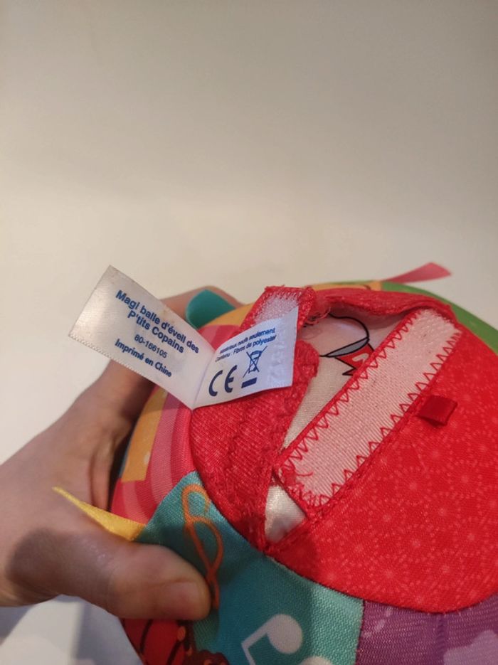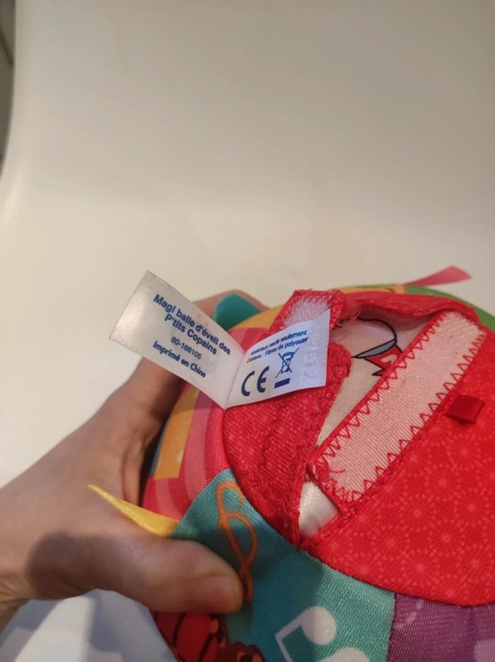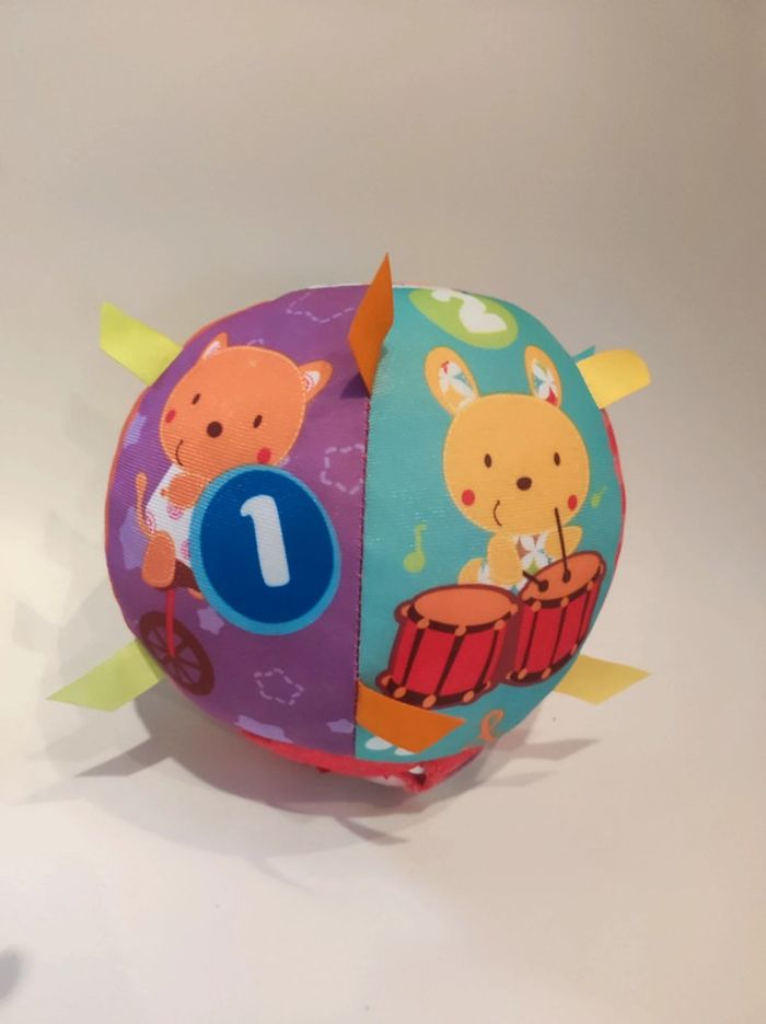 Maxi balle d'eveil des p'tits copains Marque VTech Musical et interactive Pour bébé de 6 a 36 mois. Avec de jolies couleurs (multicolores), des motifs d animaux (éléphant, ours, grenouille....) , Des chiffres. Comporte des languette et un bouton poussoir tissus pour le rendre sonore. A l intérieur on peut enclencher le mode off et mette on avec 2 volumes de son différent . Le son (bruit ou chanson) quand on la lance où on l'a fait rouler. La balle est en tissus. Lavable. Diamètre 17 cm. Elle est toute légère. Parfait état , comme neuve.