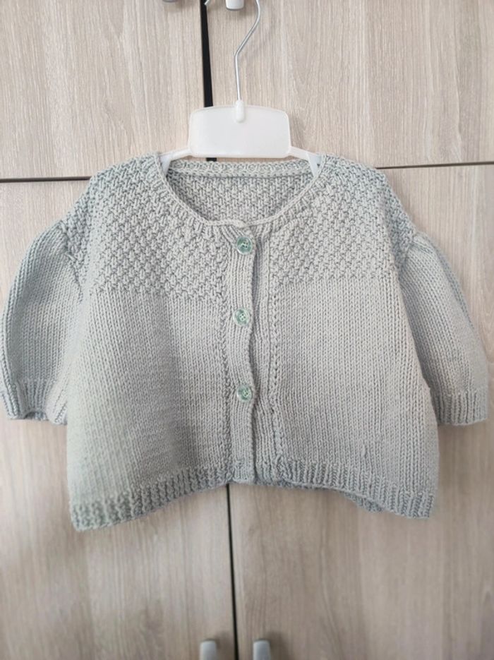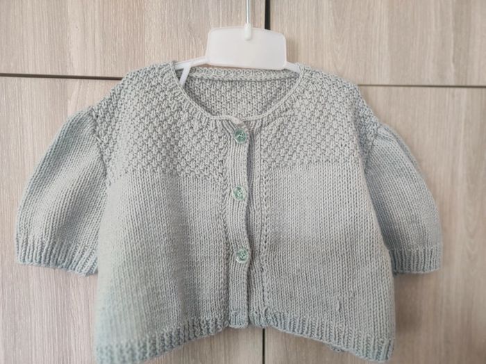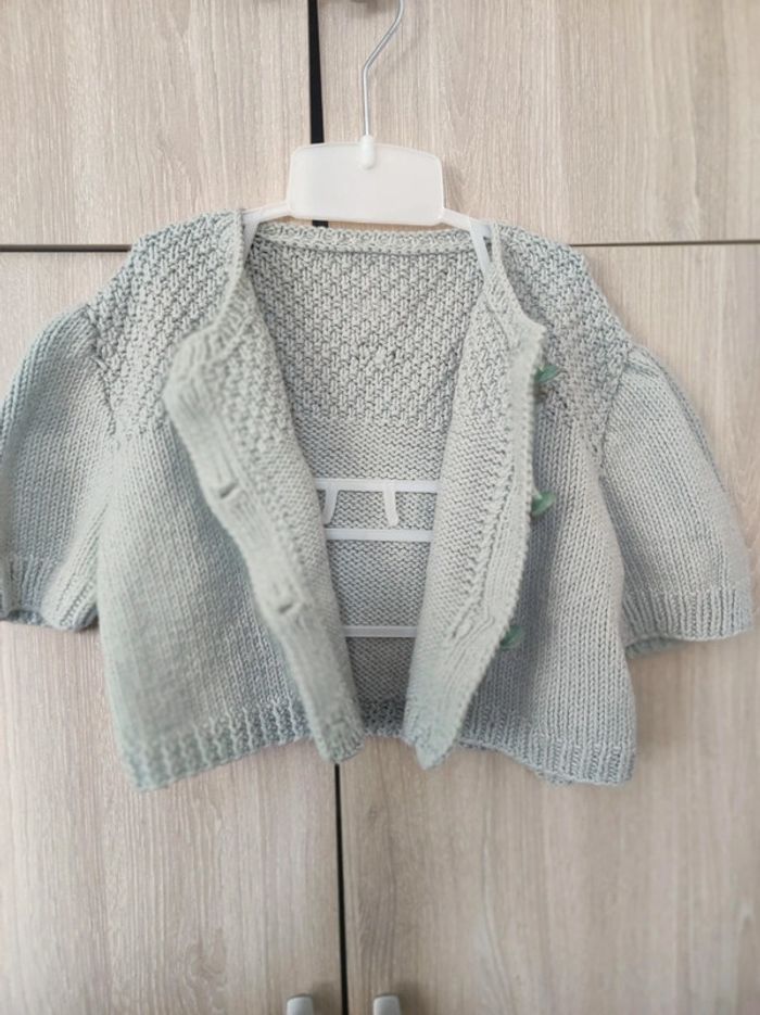 Gilet type maille crochet Modèle vintage Taille unique (correspond à du 5 / 6 ans ) Coupe courte (type boléro ) avec épaule large. Longueur 29 cm. Petites manches. Boutonnières couleurs vert d'eau transparent Parfait état #jemholofille5ans