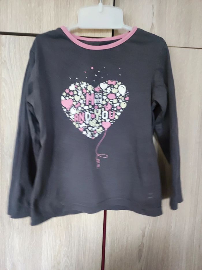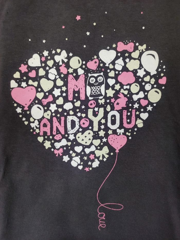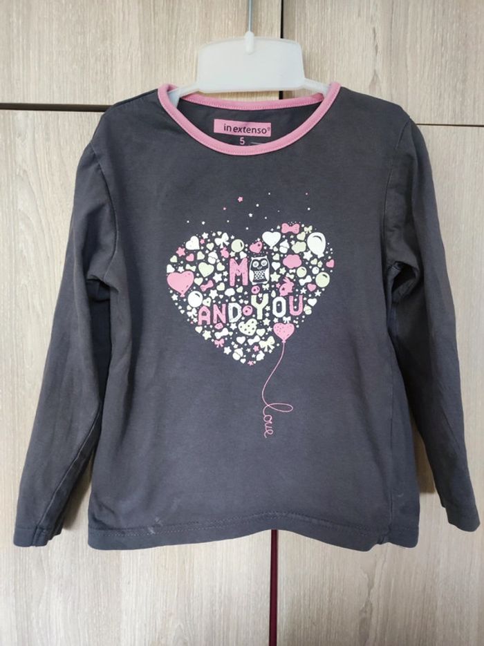T shirt manches longues Marque in extenso Taille 5 ans Col rond avec bordure rose. Couleurs uni gris avec motif coeur a l'avant et un petit hibou qui s'intègre dans l'écriture me and you. Autres petits motifs qui constitue le cœur : flot , étoile, noeud..... Parfait état . Comme neuf. Manque étiquette matière mais c'est du coton. #jemholofille5ans