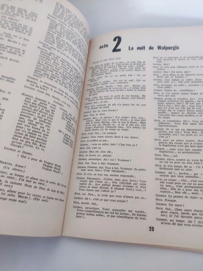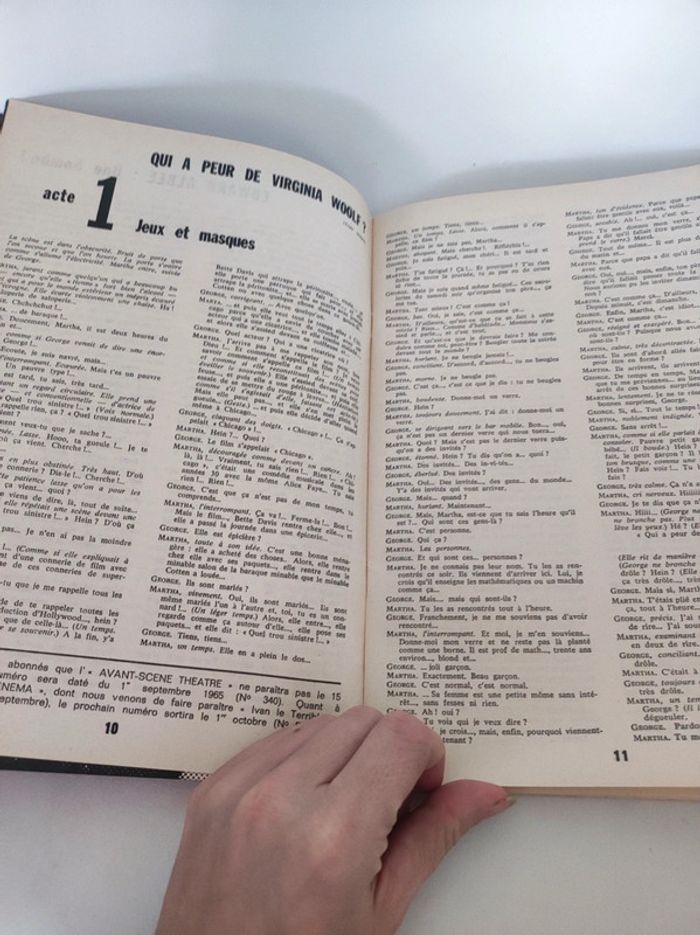 Revue / journal du théâtre ancienne / vintage L'avant scène n°339 de août 1965 bi-mensuel Qui a peur de Virginia Woolf ? Par Edward Albee. Format 26,5 x 18 cm. / 64 pages Couverture rigide. Sortie par le bureau de la revue. Une revue comportant des pièces de théâtre intégrales avec les détails des mises en scènes, des textes sur les acteurs , les coulisses, les metteurs en scènes, des articles, Des photos en noir et blanc d'acteurs (Madeleine Robinson, Raymond Gérôme...), des critiques, et une mise en avant des sorties théâtre de l'époque. Sommaire : - article Edward Albee par Jean Louis mignon - article Edward Albee : une bombe ! Par Jean cau - texte intégrale pièce Qui a peur de Virginia Woolf ? Par Edward Albee, adaptation jean cau. - texte intégrale pièce en un acte , un ami inconnu attends nos confidences par Franklin Dominguez - la quinzaine dramatique par André camp. Très bon état ! Intérieur impeccable. Imperfections : pages jaunies par le temps. quelques marques sur la couverture. Couverture rose avec une marque a l'avant en haut. Ne pas faire attention à la référence appli. Livre trop âge pour avoir un ISBN.