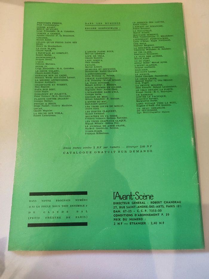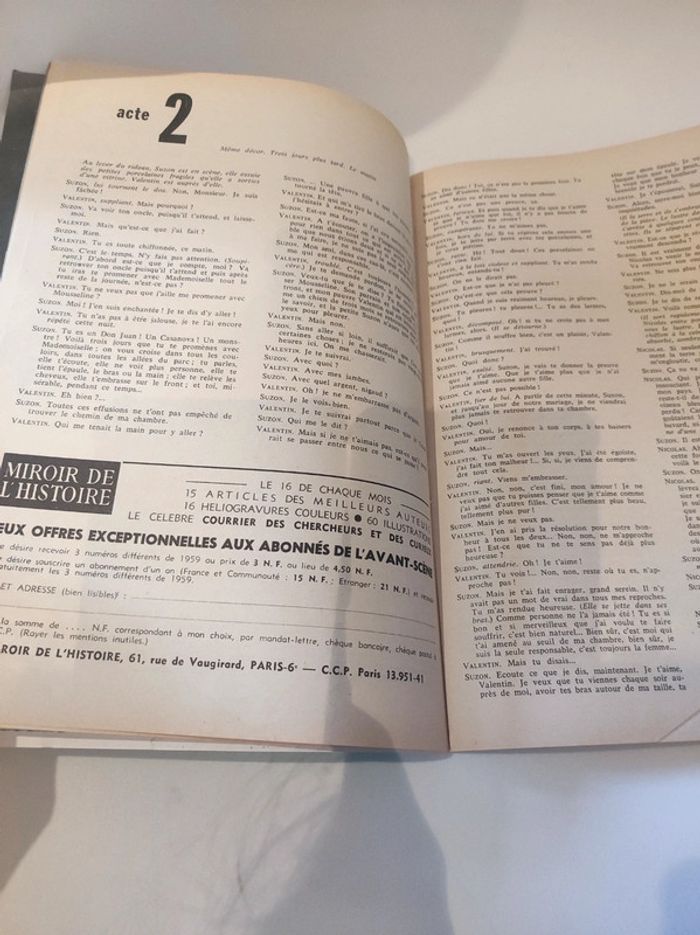 Revue / journal du theatre ancienne / vintage L'avant scène n°215 de 1960 - femina théâtre Mousseline de Louis Velle Rhinocéros d'Eugène Ionesco La quinzaine dramatique par André camp Format 26,5 x 18 cm. /50 pages / couverture rigide Sortie par le bureau de la revue. Une revue comportant des pièces de théâtre intégrales avec les détails des mises en scènes, des textes sur les acteurs , les coulisses, les metteurs en scènes, des articles, Des photos en noir et blanc d'acteurs (Thérèse Barbey...), des critiques, et une mise en avant des sorties théâtre de l'époque. Très bon état ! Interieur impeccable. Imperfections : pages jaunies par le temps. quelques marques sur la couverture Couverture verte et blanche. Ne pas faire attention à la référence de l'appli. La revue est trop âge pour avoir un ISBN .